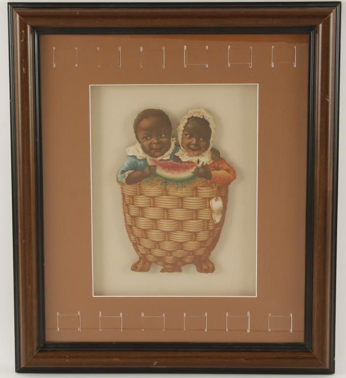 Depicting 2 African babies in basket. Image size 7-3/4" wide x 10" high. Framed and uniquely matted. 15" wide x 17-1/2" high.