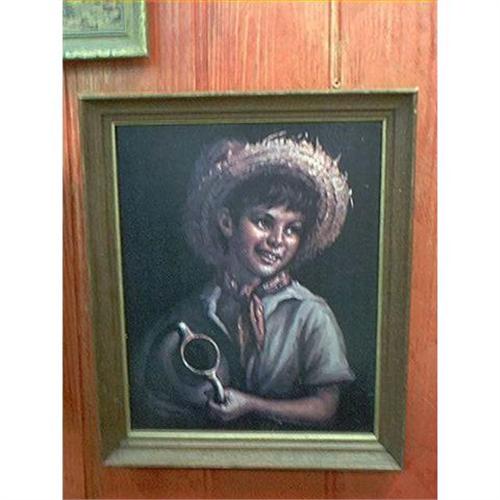 Print of a beautiful young boy in a straw hat carrying a bottle or jug. I am not sure of the age of this print but I think perhaps 1940-1950. The print is in a wooden frame with the picture and frame both being in excellent condition, The print in the frame measures 19 inches wide and is 23 inches high.