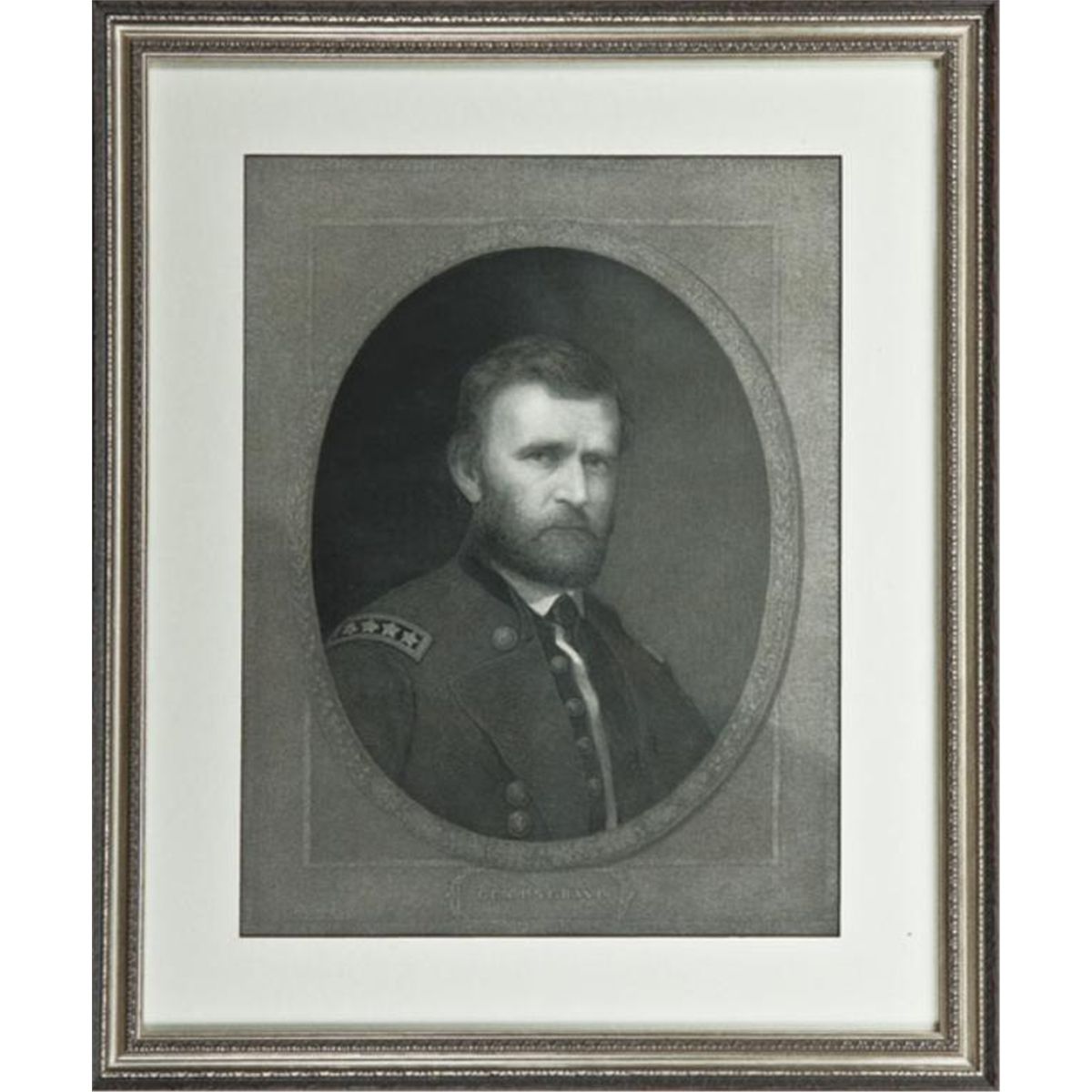 Print of General U.S. Grant in gray tones, textured to appear like material, though on paper. Measures approx. 21” by 16” image dimension. Professionally framed and matted, frame measures 29” by 24” outside dimensions. Est: $100 - $200