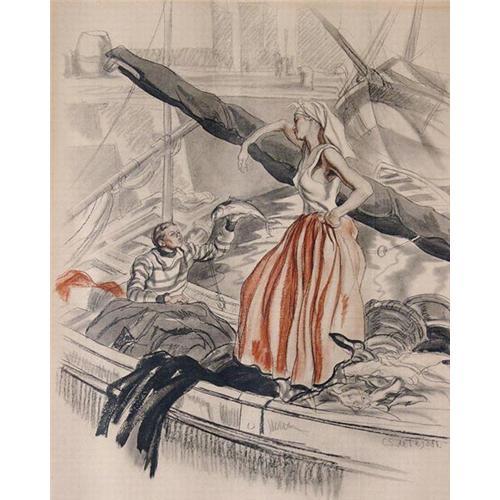 Stylized illustration by Spanish artist C. Saenz de Tejada depicting an attractive woman with a child on a fishing boat. This black, white and red drawing was probably made during the last period of Saenz de Tejada's life (1950's), when he devoted himself to genre subjects. This elegant drawing is printed on a menu of an upscale Madrid restaurant, the Commodore, still in business today. Very elegant and decorative once framed. We offer it unframed to minimize shipping costs. In good condition with some paper yellowing consistent with age. Shipping this item anywhere in the USA will cost USD$7 via registered Post Office Airmail, service is very reliable but does not offer insurance. Please ask questions, request additional photos and shipping details before bidding.