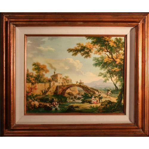 </font></strong>?Town by the Water? is a beautiful print reproduction of a sweeping landscape genre scene from the 16th or 17th century. In it we see a quaint village perched atop a cliff and a bridge spanning the river below. A woman is washing clothes a the water?s edge and a family sits on the opposite bank. Various villagers can be seen going about their daily routine, crossing the bridge on horseback, carrying clothes back up to the town, etc. The landscape was painted in fine detail with the large trees fully articulated down to the soft gold of their changing leaves. The print was transferred onto a canvas which was then stretched and coated with clear varnish to give the appearance of brushstrokes. The piece has been mounted in an absolutely stunning copper/gold wood frame with intricate beveling and a cream liner with a copper/gold inner fillet. Including the gorgeous frame this piece measures 29 ½? x 25 ½.? ?Town by Water? is a wonderful reproduction that would be an affordable alternative to an original painting, without sacrificing quality and elegance. </font>