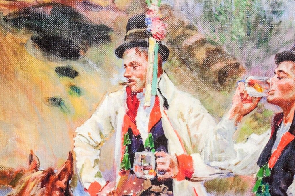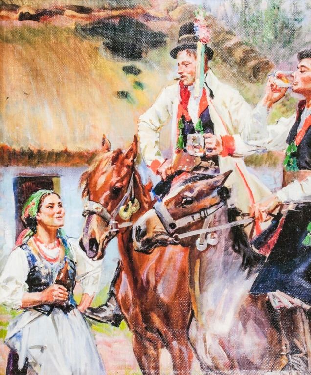 Print on canvas, framed. Featuring two men on horses drinking beer with a woman standing beside them. Printed signature partially hidden by frame. Canvas size: 50 x 42 cm (19.75 x 16.5 inches). Frame size: 60 x 52 cm (23.75 x 20.5 inches).