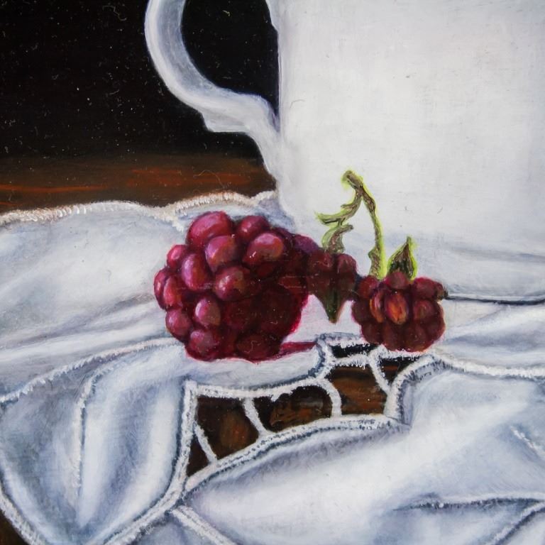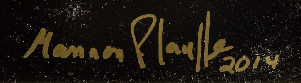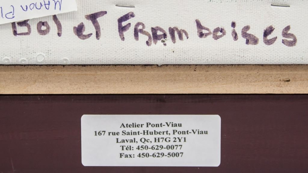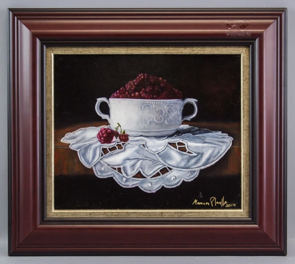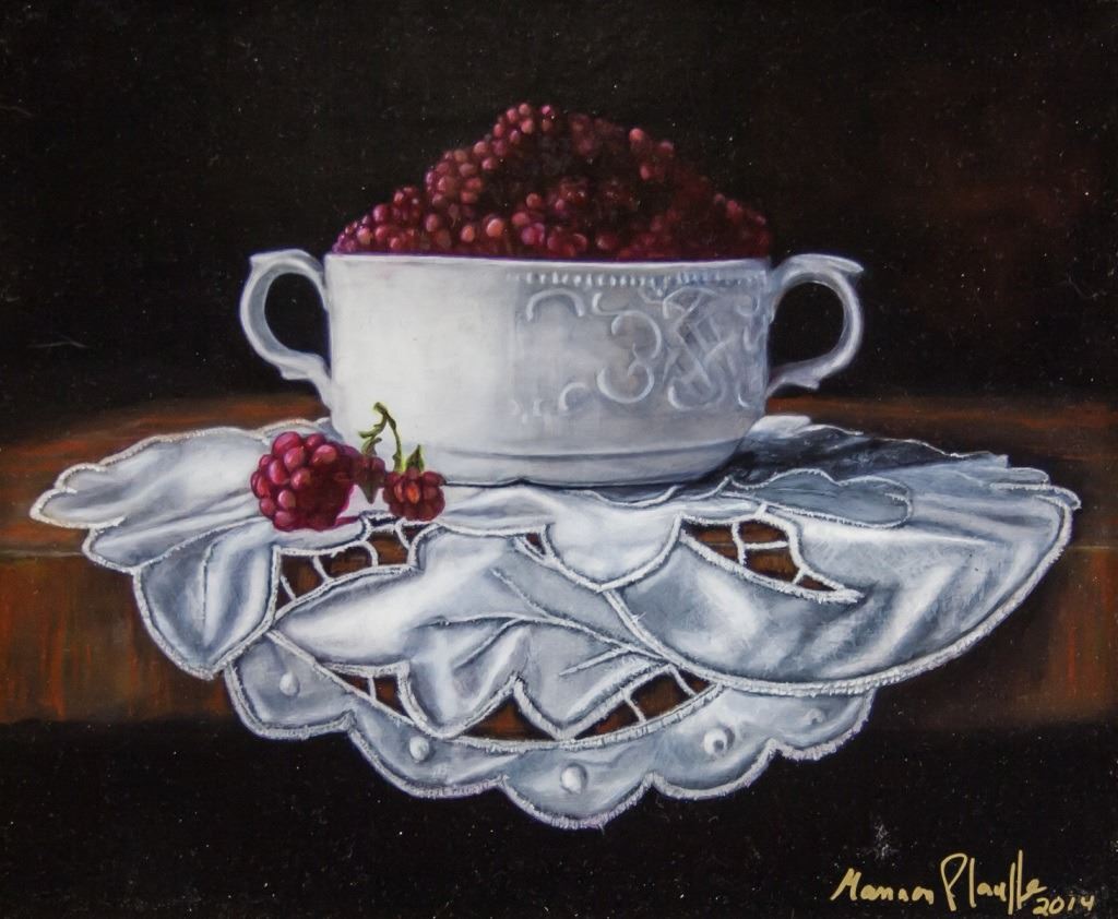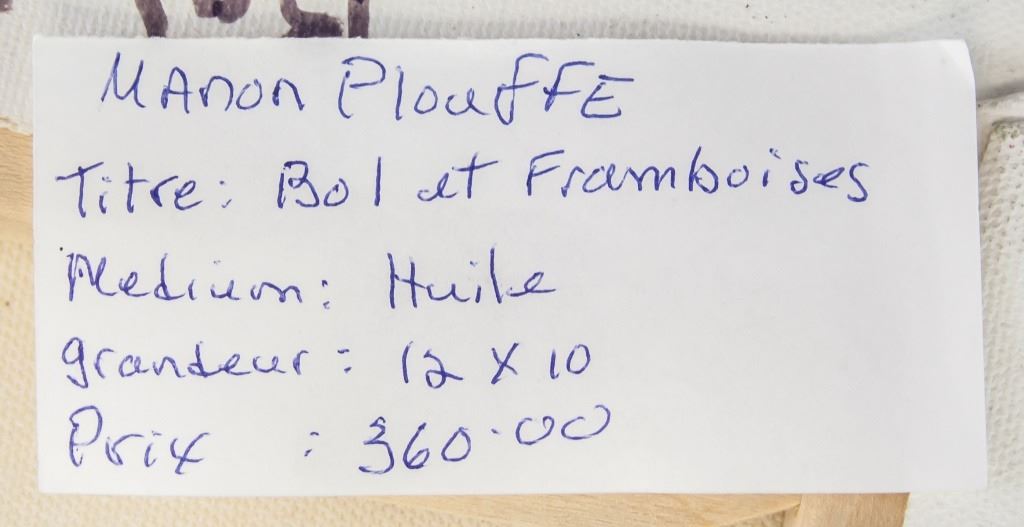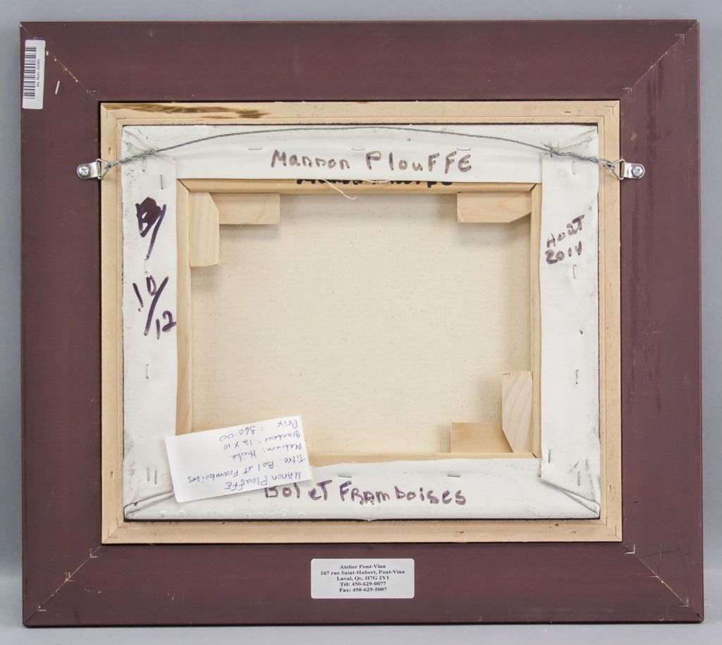 Print on canvas, framed. Featuring a bowl of raspberries. "Mannon Plouffe" to the bottom right corner. "2014" inscribed beneath the signature. "Mannon Plouffe Bol et Framboises" inscribed on verso. Canvas size: 24.5 x 29.5 cm (9.7 x 11.5 inches). Frame size: 39 x 44 cm (15.5 x 17.5 inches).