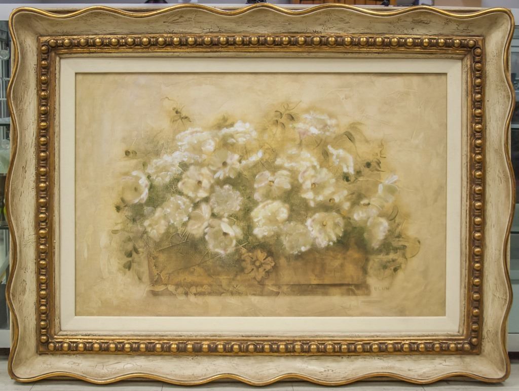 Print on canvas, framed. Featuring flowers. Possibly hand-embellished. "BLUM" to the bottom right corner. Canvas size: 58 x 90 cm (22.7 x 35 inches). Frame size: 89 x 119 cm (35 x 46.7 inches).