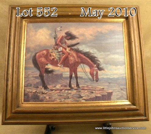 Print on canvas hand signed by prominent western artist, Joe Grandee. Approx. 15-1/2" by 20", gallery priced up to $900. Nicely framed. Joe Grandee was one of the top Western artists in America during his lifetime and his career peakedin the early 1970's when his work hung in Nixon's Whitehouse. Now deceased, his prints on canvas are decorative and collectable. Est: $200 - $400