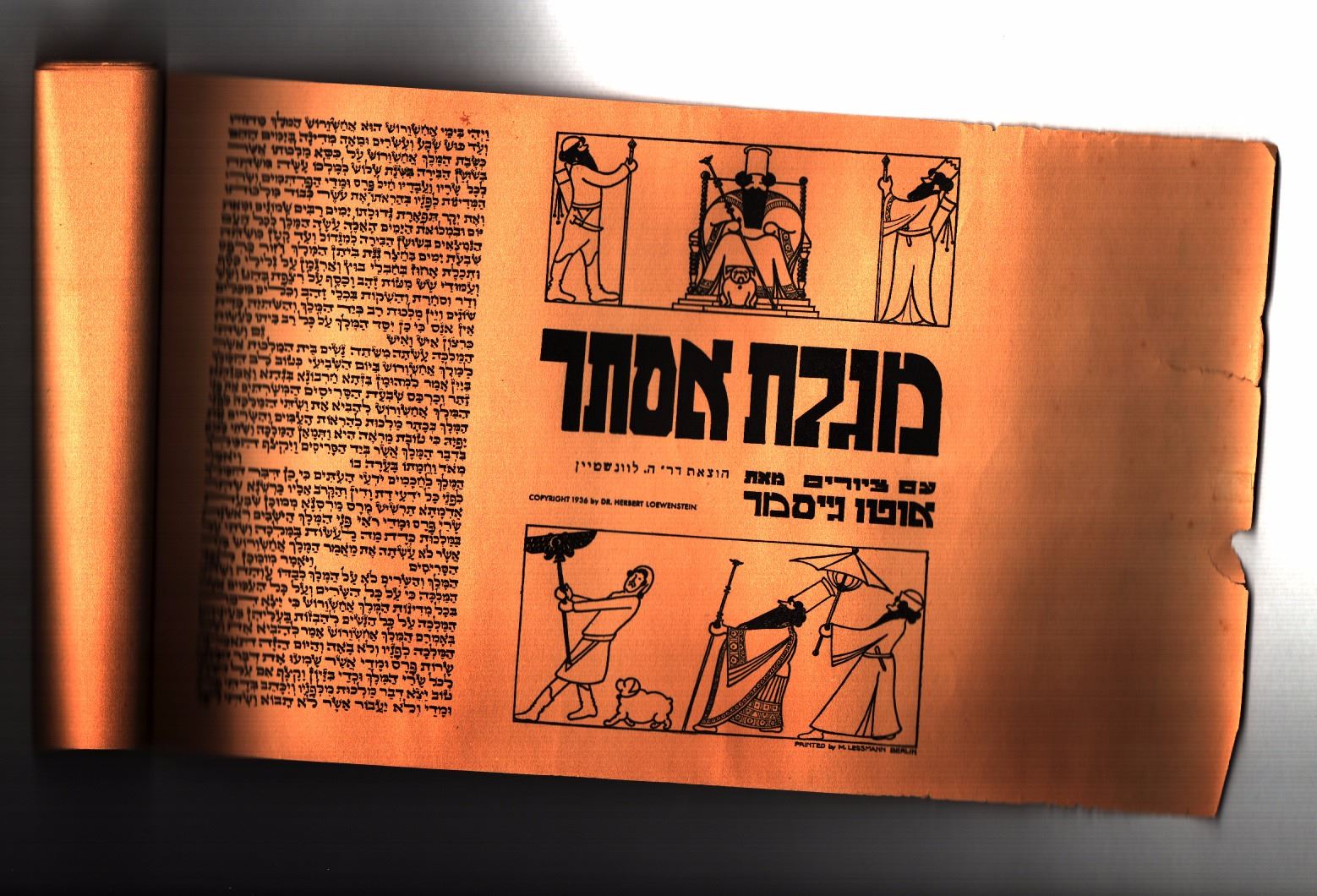 Printed Megillat Esther with paintings by Otto Geismar. Printed by Dr. H. Levinstein, Berlin, 1936. Width: 21 cm. First pages slightly torn, yellowing.
