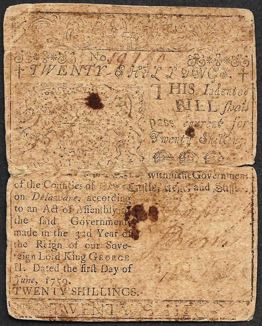 One Printed by Ben Franklin June 1, 1759 Delaware Twenty Shillings Colonial Currency Note.