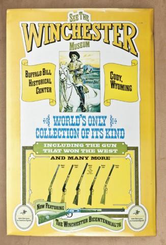 Printed on tin advertiser, 28” by 18-1/2”, shows Buffalo Bill Cody at center and reads See the Winchester Museum and Buffalo Bill historical center, Cody, Wyoming- World’s only collection if its king. Shows Winchester rifles from 1866 to 1976 bicentennial. Very good condition, some minor aging. Circa approx. 1975-76. Est: $150 - $300
