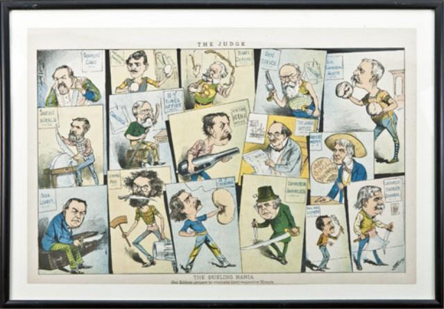 Printed page from The Judge magazine. Approx. 13” by 20”. Entitled The Dueling Mania. Our editors prepare to vindicate their prospective honors. Shows Brooklyn Eagle, New York Tribue, New York Herald, The Judge, Louisville Courrier Journal and other editors with various bowie knives, swords, pistols, cannon, boxing gloves, and other weapons. Ready to duel. From the William R. Orbelo Collection. Est: $150 - $300