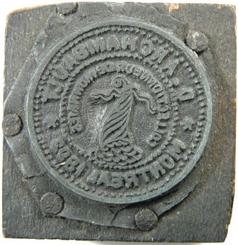 Matched pair of cast metal printing plates individually mounted on wood blocks that were used in the printing of PN Bretons Illustrated History of the Coins and Tokens Relating to Canada published in Montreal in 1894. The pair of engravings for Breton 635 - D Archambault