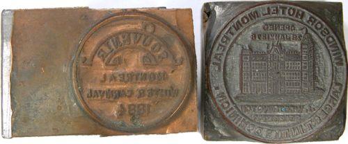 Leroux 1149, Souvenir Montreal Winter Carnival 1884. Copper-Clad Lead Printing Plate for reverse. Plus Leroux 1535, Windsor Hotel, Montreal Carved Wood Printing Block for obverse