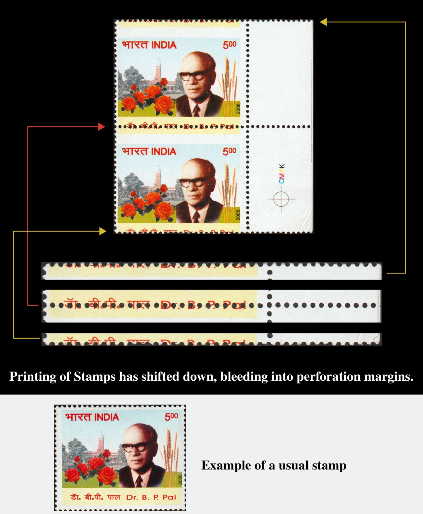Error, Republic India, Commemorative Series, 2008, 5Rs, Dr. Benjamin Peary Pal (Agricultural Scientist), Vertical pair of 2 stamps, printing of both stamps are shifted towards bottom, “Printing Registration mark” in right margin, Phila # 2341 type, MNH.