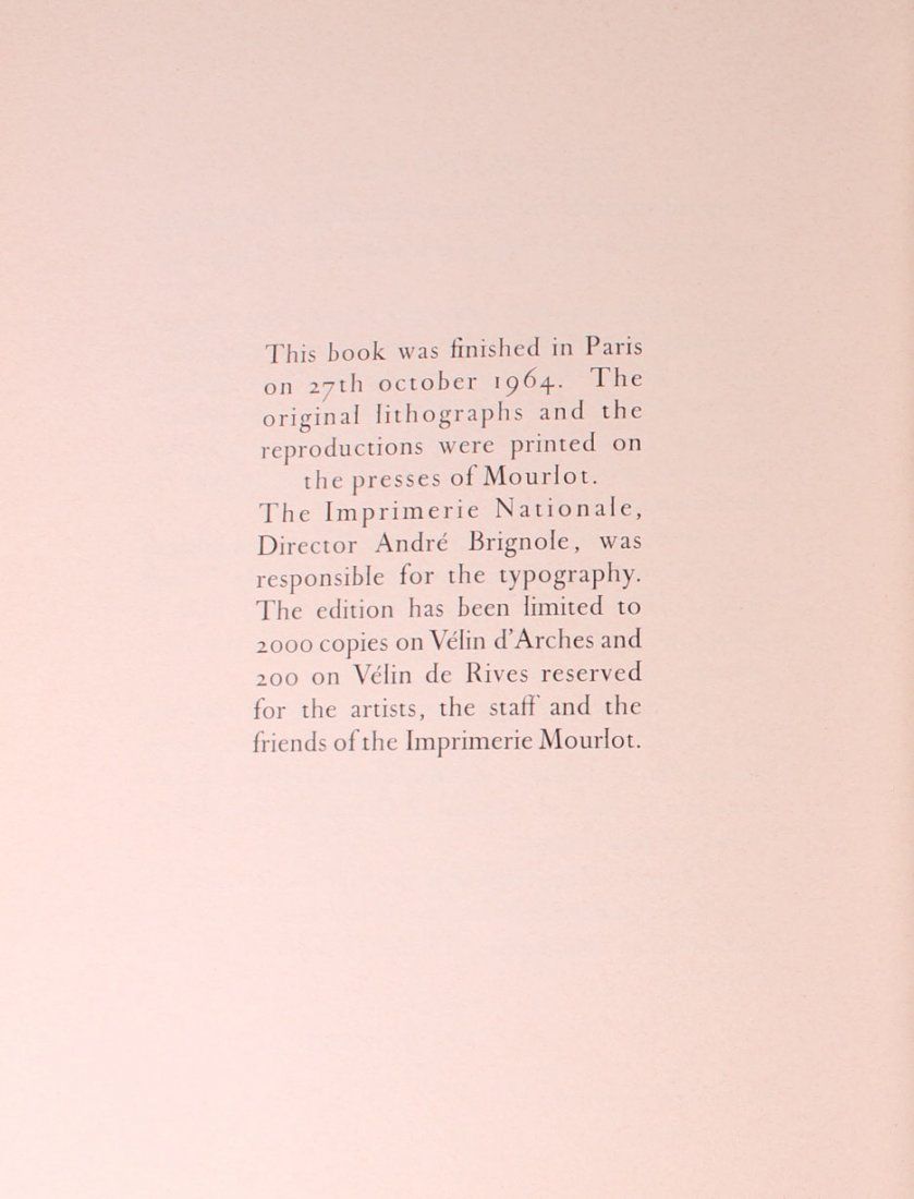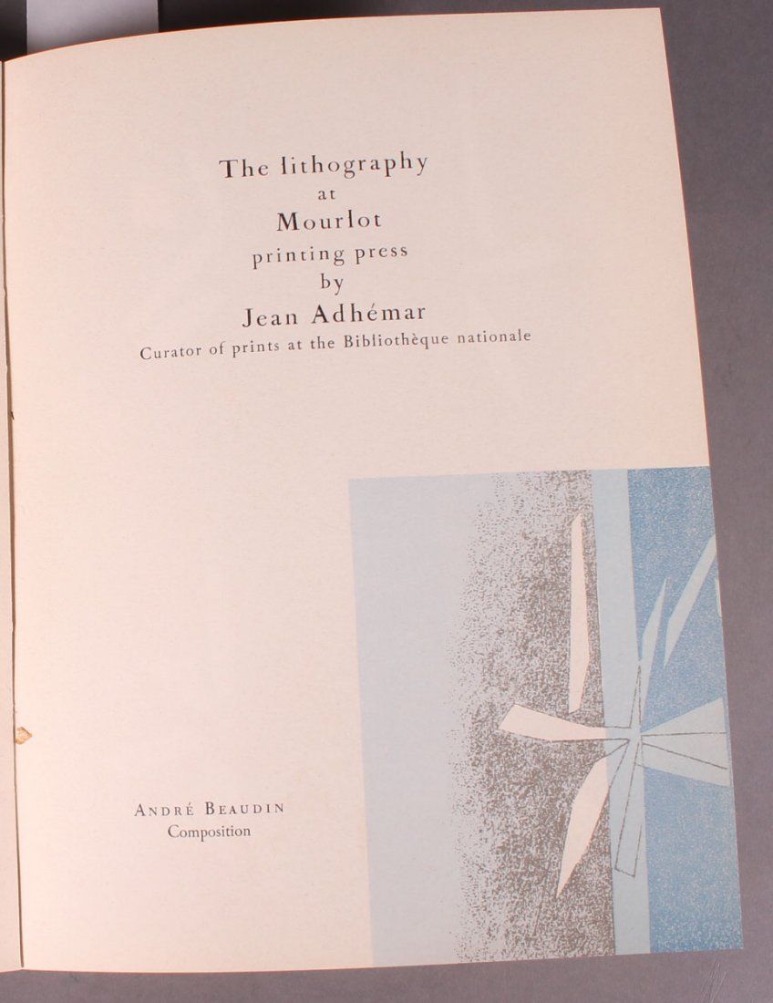 [Prints]. PRINTS FROM THE MOURLOT PRESS: Exhibition Sponsored by the French Embassy Circulated by the Traveling Exhibition Service of the National Collection of Fine Arts Smithsonian Institution 1964-1965. (Fernand Mourlot, 1964). 17 plates: B/W frontis after Picasso + 16 color plates after Georges Braque, Andre Beaudin, Maurice Esteve, Jacques Villon, Henri Matisse, Paul Guiramand, Richard Flosheim, Bernard Cathelin, Andre Brasilier, Maurice Brianchon, Andre Minaux, Paul Jenkins, Alexander Calder, Akiro Kito, Alberto Giacometti, and Fritz Glarner. Total of 2200 issued; one of 2000.