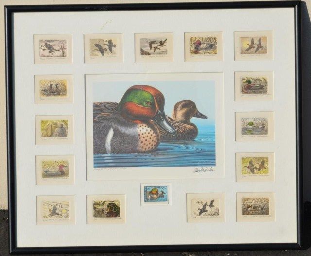Prints of duck stamps by Ken Michaelsen, all #1 of 100 center print, 8-1/2” x 11”; 15 smaller prings of stamps, 2-1/2” x 3”; one original 7.50 stamp matching center art; a unique artwork probably obtained by Petersenat Ducks Unlimited or Wildlife show. From the estate of Robert Petersen. Est.: $250-$500.