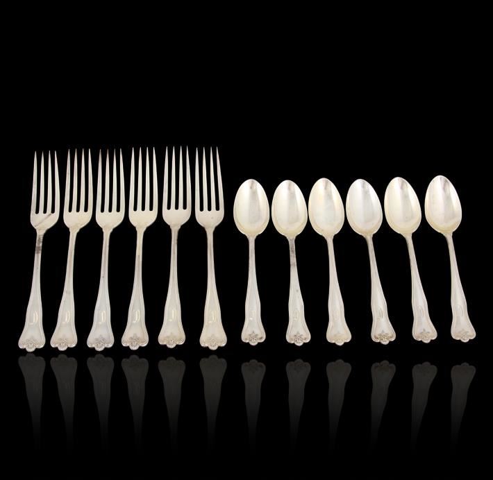 "Priscilla" pattern by Frank Smith circa 1918. This beautiful antique set consists of (6) dinner forks 7", and (6) teaspoons 5.75" all bare the single monogram initial "C" or "D" in Old English. Great estate condition.