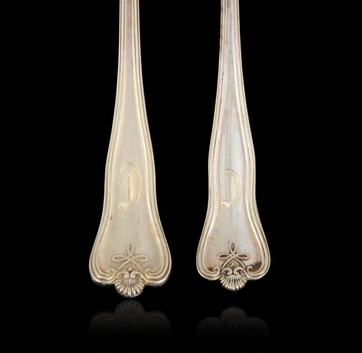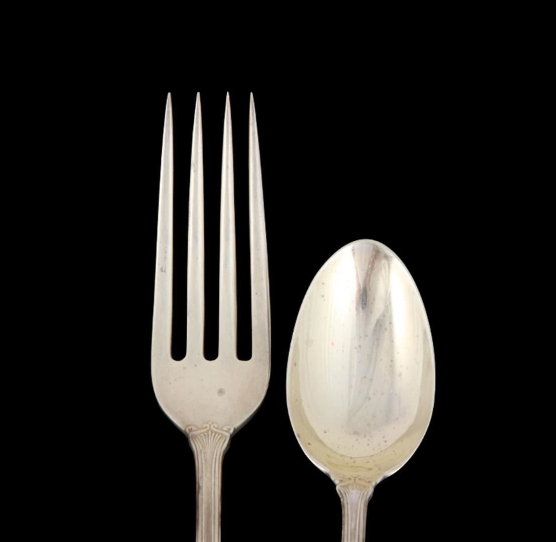 "Priscilla" pattern by Frank Smith circa 1918. This beautiful antique set consists of (6) dinner forks 7", and (6) teaspoons 5.75" all bare the single monogram initial "C" or "D" in Old English. Great estate condition.