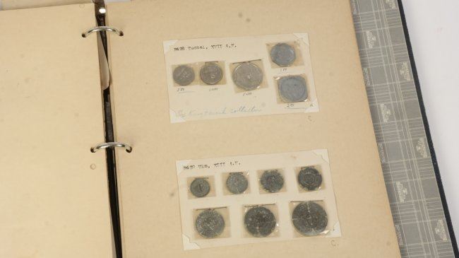 A further old time collectors' selection of WWI metal prisoner of war tokens arranged alphabetically from N - Z. Over 100 tokens mounted on paper pages. Tokens generally corroded, very good for their types. Another very important reference collection put together long ago.