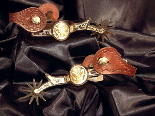 Prison Made Spurs, marked by maker Gulliory, Colorado. Double mount silver and brass overlay. Tooled leathers. Excellent condition.