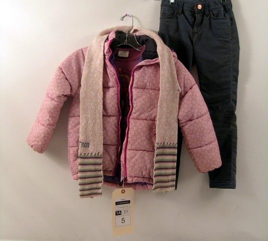 Anna Dover (Erin Gerasimovich) screen worn, hero, slightly worn, pink with pink circle print 'H&M' puffy coat, (size 5-6) very worn and bloody, lavender long sleeve with bird graphic 'Mini Boden' shirt, (size 5-6) worn blue faded skinny 'H&M' pants, (size 5-6) and pink heather with stripes scarf. Includes wardrobe tag!