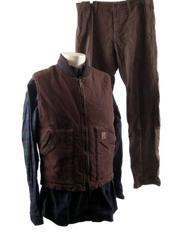 From the thrilling movie Prisoners (2013) starring Hugh Jackman is Keller Dover's (Hugh Jackman) complete screen worn hero costume with wardrobe tag from the production company. This complete costume includes his hero brown zipper front 'Carhartt' vest, (size L) green and blue flannel long sleeve button front 'LL Bean' shirt, (size L) and khaki 'Eddie Bauer' pants with flannel lining. (size 34 x 35) Includes wardrobe tag.