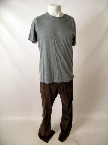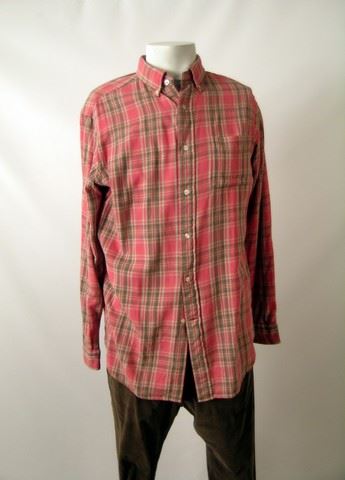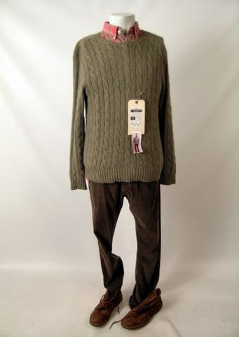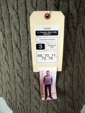 Franklin Birch (Terrence Howard) screen worn, hero, pale green grey wool cable knit long sleeve 'Polo' sweater, (size L) pink and green plaid long sleeve button front 'Cremeiux' shirt, (size M) brown straight leg 'Tommy Bahama' corduroy pants, (size 34) and dark brown leather 'Clarks' boots. (size 11 1/2) Includes wardrobe tag!
