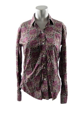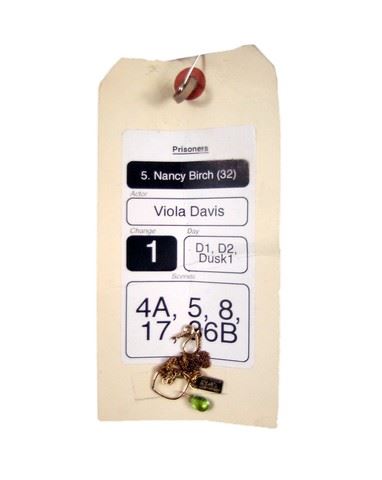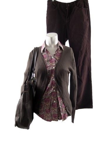 Nancy Birch (Viola Davis) screen worn, hero, olive green long sleeve v-neck 'Calvin Klein' cardigan sweater, (size L) purple, pink, and green paisley print long sleeve button front 'Ann Mashbun' shirt, (size L) faux gold necklace, dark brown leather 'The Sak' purse, and dark brown corduroy 'NYDJ' pants. (size 10) Includes wardrobe tag.
