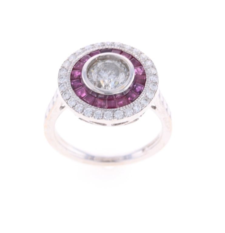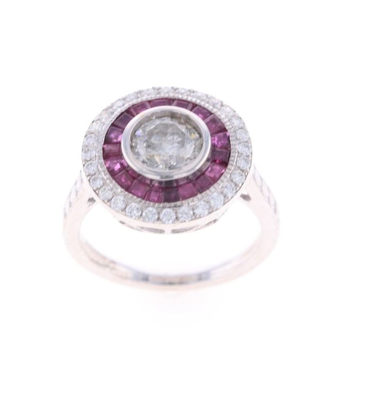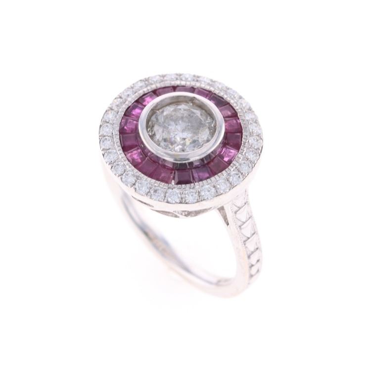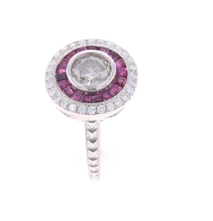Featured in this lot is this pristine ruby, diamond, and 18k white gold ring with AIGL paperwork. The ring features one polished, stamped, and tested 18k white gold ring with a bright finish and an Oscar Friedman hallmark next to an 18k gold stamp. The ring features a center stone of a single natural round brilliant cut diamond and shows measurements of 6.6mm in diameter x 4.2mm, with a clarity of I1, a color gradient of J, and a total weight of 1.19 carats. The center stone is decorated with 18 natural square step cut rubies with measurements of 2 x 2mm, red color, and a total weight of 0.33 carats. The second ring of stones is profusely decorated with a total of 28 natural round brilliant cut diamonds with measurements of 1.4mm, clarity of VS2 – SI1, a color gradient of F – G, and a total weight of 0.33 carats. The piece comes complete with AIGL Inc. (American International Gemological Laboratories, Inc. a GIA certified lab AIGL#: K69D93-EA16429) report and appraisal, confirming the above info and giving a total value of $15,231.00. The ring size is US 6 1/2.