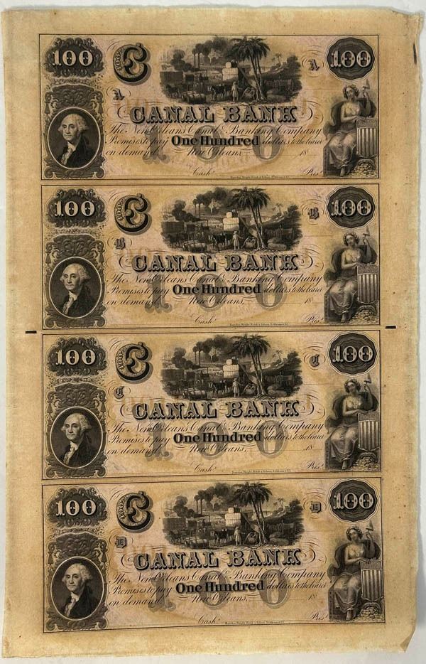 Private Banks and Local Issues, 1850's, $100 Canal Bank, New Orleans, LA., uncut sheet of 4. Haxby-LA-105-G60a, Plate #A-D, Crisp Unc