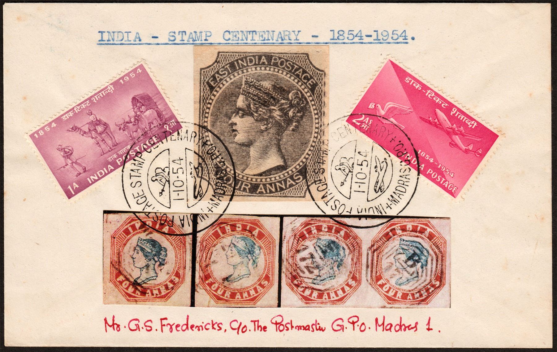 Private Cover, 1954, 1 & 2 Annas stamps of डाक टिकट शताब्दी cancelled with 2 round pictorial seals signifying India’s postal journey of 100 years from a postman on foot to Airmail and text as “INDIA POSTAGE STAMP CENTENARY | 1-10-54 | MADRAS G.P.O.”, Photos/images of 4 Annas of Queen Victoria block of 4 with different hexagonal cancellations, photo of 4 Annas of Queen Victoria with inscription as “EAST INDIA POSTAGE”, addressed to “Mr. G.S. Fredericks, C/o. The Postmaster C.P.O. Madras 1.”, and printed on the top of the cover as “INDIA – STAMP CENTENARY – 1854-1954”, good condition, Rare.