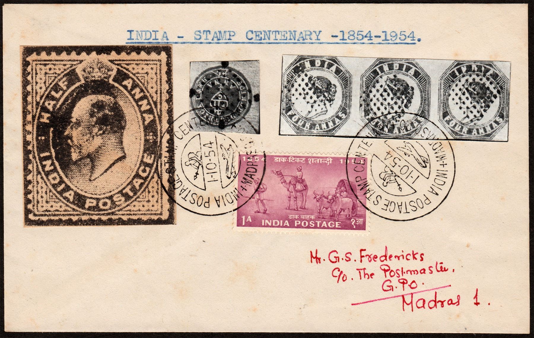 Private Cover, 1954, 1 Anna stamp of डाक टिकट शताब्दी, Photos of ½ Anna Scinde Dawk stamp with 1 side margin pasted upside down, ½ Anna King Edward stamp, Queen Victoria 4 Annas lithographs set of 3 with 8X8 diamond cancellations, also cancelled with 2 round pictorial seals signifying India’s postal journey of 100 years from a postman with hand delivery to Airmail and text as “INDIA POSTAGE STAMP CENTENARY | 1-10-54 | MADRAS G.P.O.”, addressed to “Mr. G.S. Fredericks, C/o. The Postmaster C.P.O. Madras 1.”, and printed on the top of the cover as “INDIA – STAMP CENTENARY – 1854-1954”, excellent condition, Rare.