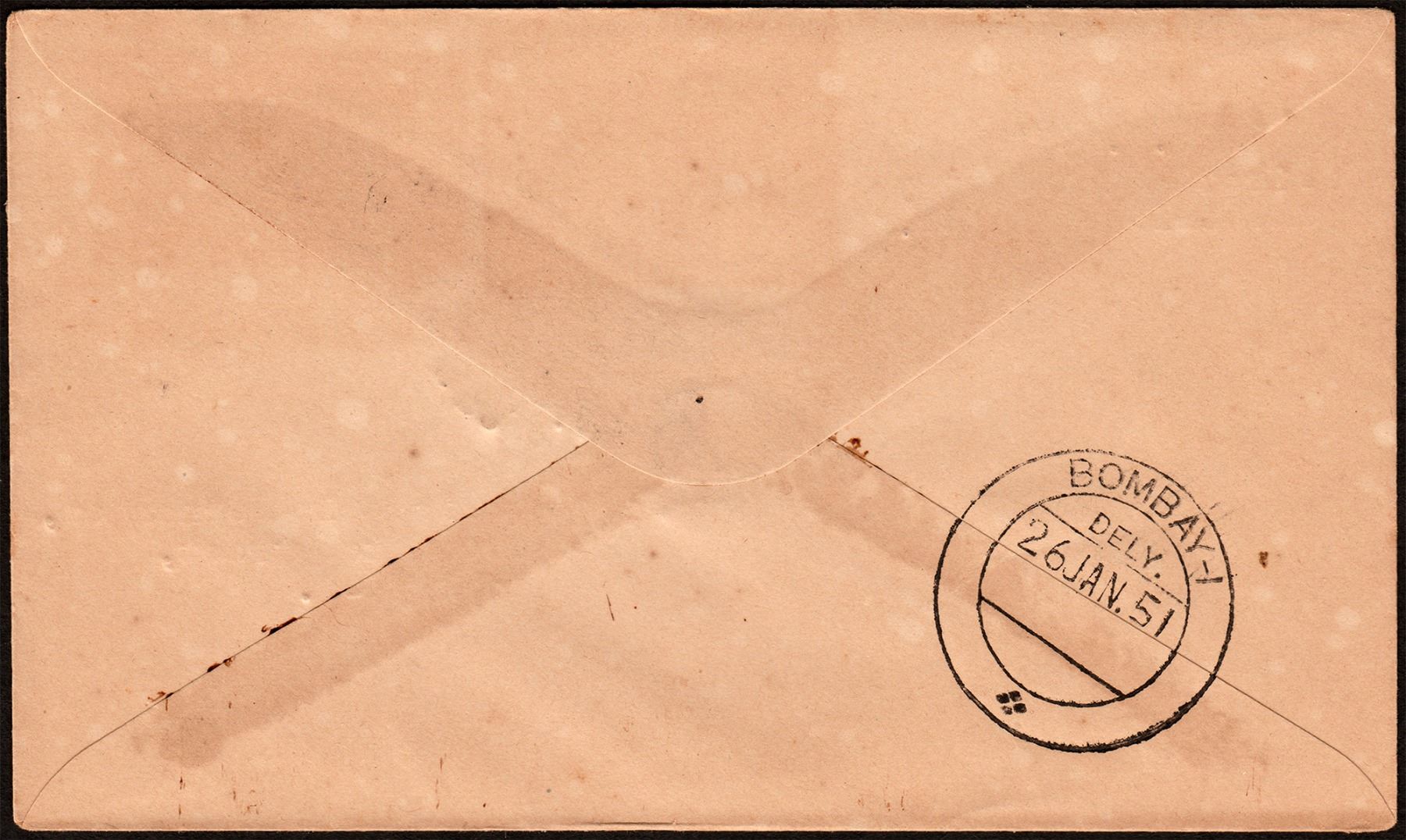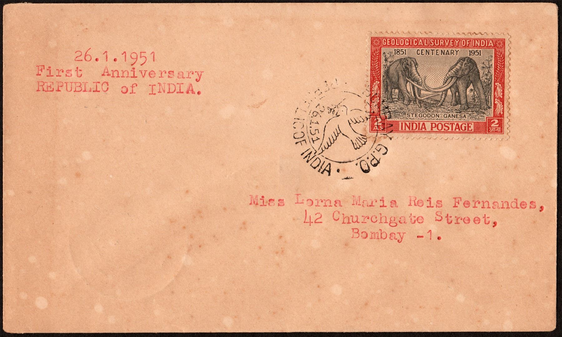 Private Cover, First Anniversary Cover of Republic India, 1951, 2 Annas stamp of Geological survey of India, cancelled with a round pictorial dispatch seal with pigeon in it as “BOMBAY G.P.O. | 26.1.51 | REPUBLIC OF INDIA”, addressed to “Miss Lorna Maria Reis Fernandes, | 42 Churchgate Street, | Bombay – 1.”, Republic India’s first anniversary is marked on the front side of the cover as “26.1.1951 | First Anniversary | REPUBLIC of INDIA.”, a round delivery seal on the back side of the cover as “BOMBAY | DELY. | 26 JAN. 51”, good condition, Rare.