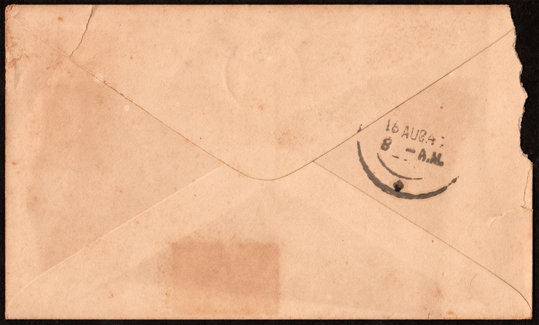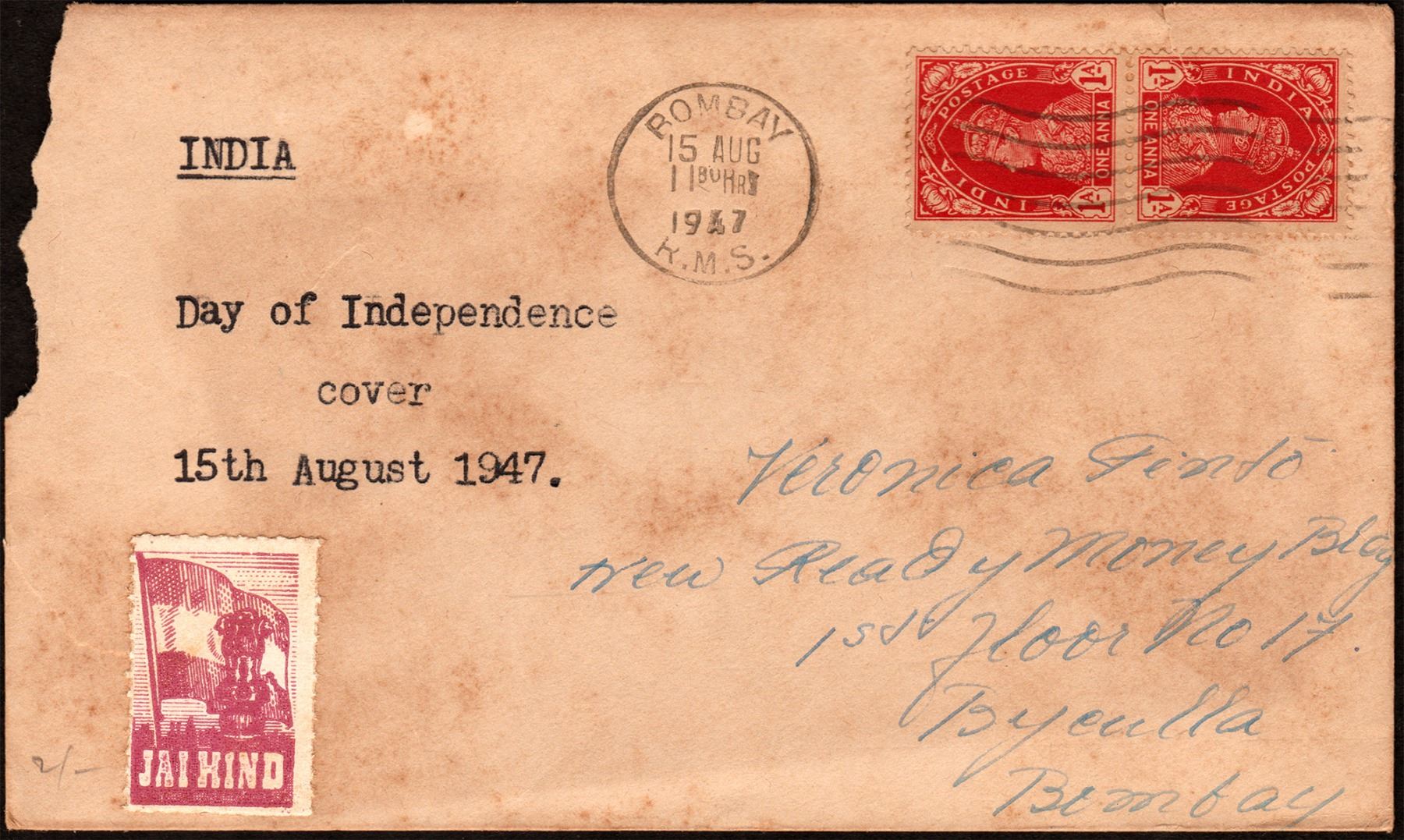Private Cover, R.M.S. Cover, 1947, 1 Anna, King George VI, Tête-bêche Stamp, Jain Hind label tied, stamps cancelled with Black Roller seal and a round seal as “BOMBAY | 15 AUG | 1130 HRS | R.M.S.” addressed to “Veronica Pinto | New Ready Money Bldg | 1st floor no 17 | Byculla | Bombay”, with text as “INDIA | Day of Independence | cover | 15th August 1947.” And a delivery seal as “?? | 16 AUG 47 | 8 – AM.”, some usual torn, otherwise good condition, Rare.