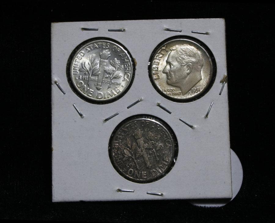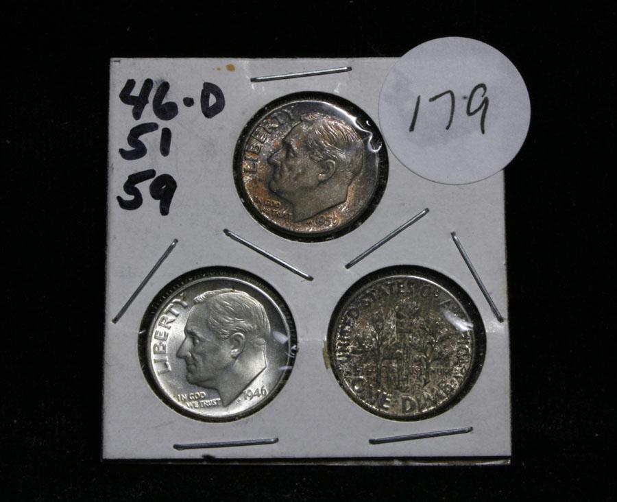 This lot includes 3 Roosevelt dimes, the 46-d looks to be ms63/64 and the 51-p looks ms63/64 and the 59-p, appears ms65 and deeply and beautifully toned with nice colors, all three are attractively toned. This lot is part of a cool private consignment which I have broken up into 17 lots in this auction. Half of the lots are very attractive all original and mostly attractively toned Roosevelt dimes which are in not often seen triple 2x2 holders. most have obviously been carefully hand picked. The other 8 lots are fantastic cherry picked Mint sets running from 1957-1964, all are wonderful, and again in cool old fashioned folders. This lot I would estimate the value to be $40