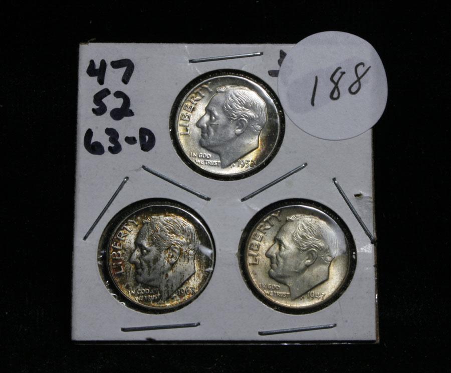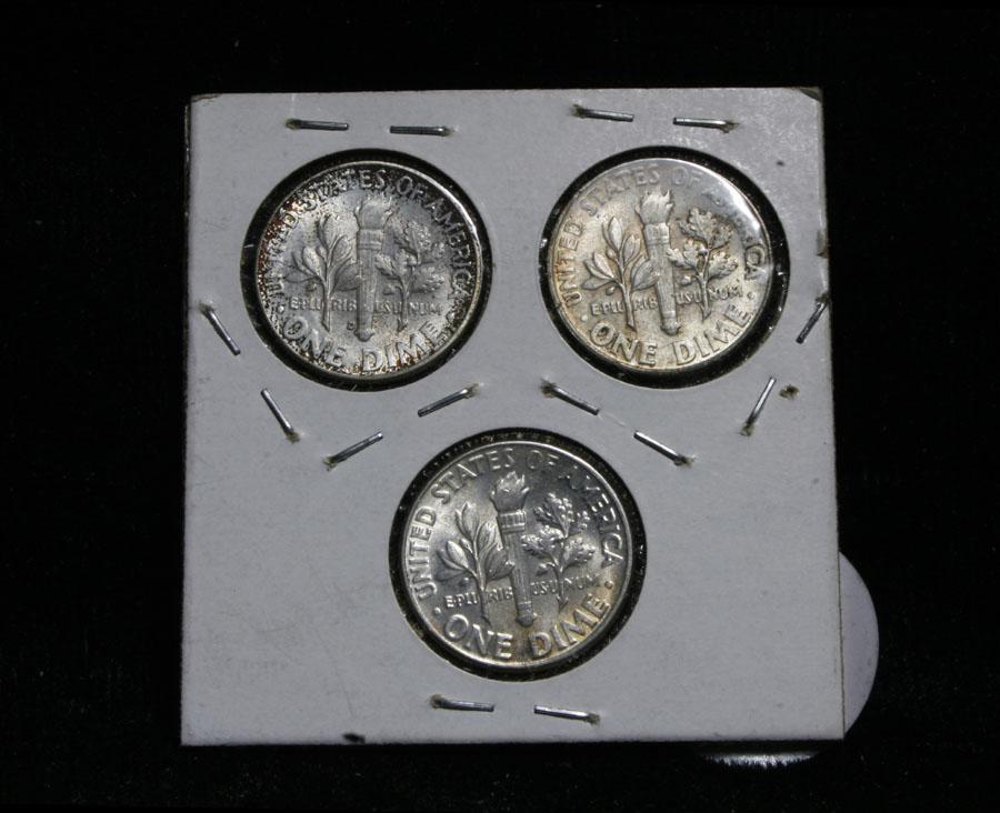 This lot includes 3 Roosevelt dimes, the 47-p looks to be ms63/64 and the 52-p looks ms64/65 and the 63-d, appears ms65. This lot is part of a cool private consignment which I have broken up into 17 lots in this auction. Half of the lots are very attractive all original and mostly attractively toned Roosevelt dimes which are in not often seen triple 2x2 holders. most have obviously been carefully hand picked. The other 8 lots are fantastic cherry picked Mint sets running from 1957-1964, all are wonderful, and again in cool old fashioned folders. This lot I would estimate the value to be $30