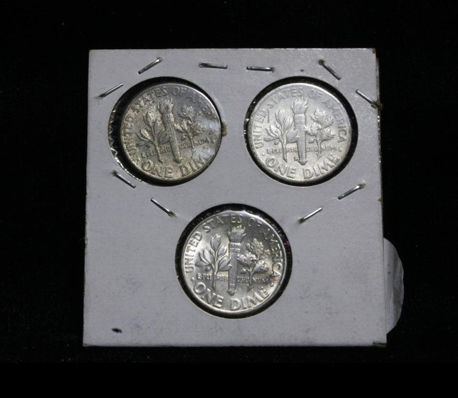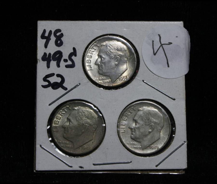 This lot includes 3 Roosevelt dimes, the 48-p looks to be ms60/61 and the 49-s, a great date looks xf45 and the 52-p, a great date appears ms64. This lot is part of a cool private consignment which I have broken up into 17 lots in this auction. Half of the lots are very attractive all original and mostly attractively toned Roosevelt dimes which are in not often seen triple 2x2 holders. most have obviously been carefully hand picked. The other 8 lots are fantastic cherry picked Mint sets running from 1957-1964, all are wonderful, and again in cool old fashioned folders. This lot I would estimate the value to be $25