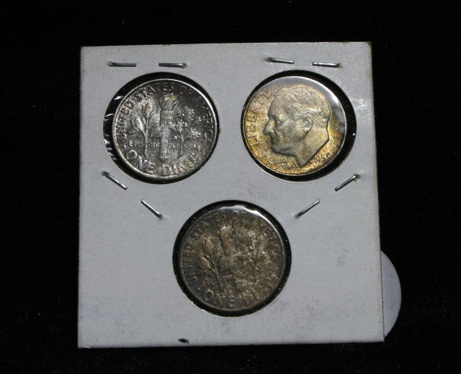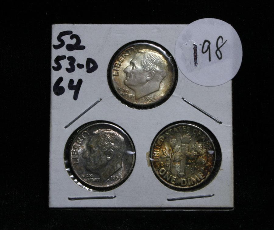 This lot includes 3 Roosevelt dimes, the 52-p looks to be ms63/64 and the 53-d looks ms64 and wonderfully toned with 2 cool die breaks/chips and the 64-p, appears ms64 and also wonderfully toned. This lot is part of a cool private consignment which I have broken up into 17 lots in this auction. Half of the lots are very attractive all original and mostly attractively toned Roosevelt dimes which are in not often seen triple 2x2 holders. most have obviously been carefully hand picked. The other 8 lots are fantastic cherry picked Mint sets running from 1957-1964, all are wonderful, and again in cool old fashioned folders. This lot I would estimate the value to be $30