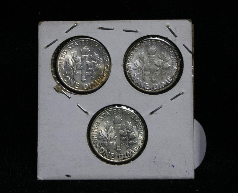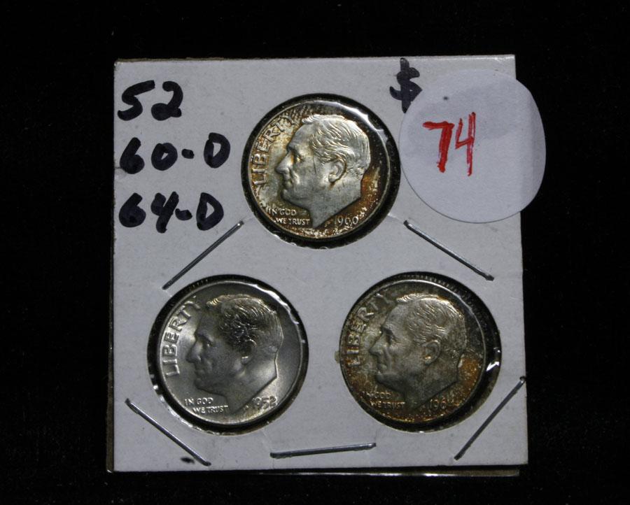 This lot includes 3 Roosevelt dimes, the 52-p looks to be ms65 and very attractively toned and the 60-d looks ms64 and the 64-d, appears ms64, all three are attractively toned. This lot is part of a cool private consignment which I have broken up into 17 lots in this auction. Half of the lots are very attractive all original and mostly attractively toned Roosevelt dimes which are in not often seen triple 2x2 holders. most have obviously been carefully hand picked. The other 8 lots are fantastic cherry picked Mint sets running from 1957-1964, all are wonderful, and again in cool old fashioned folders. This lot I would estimate the value to be $30
