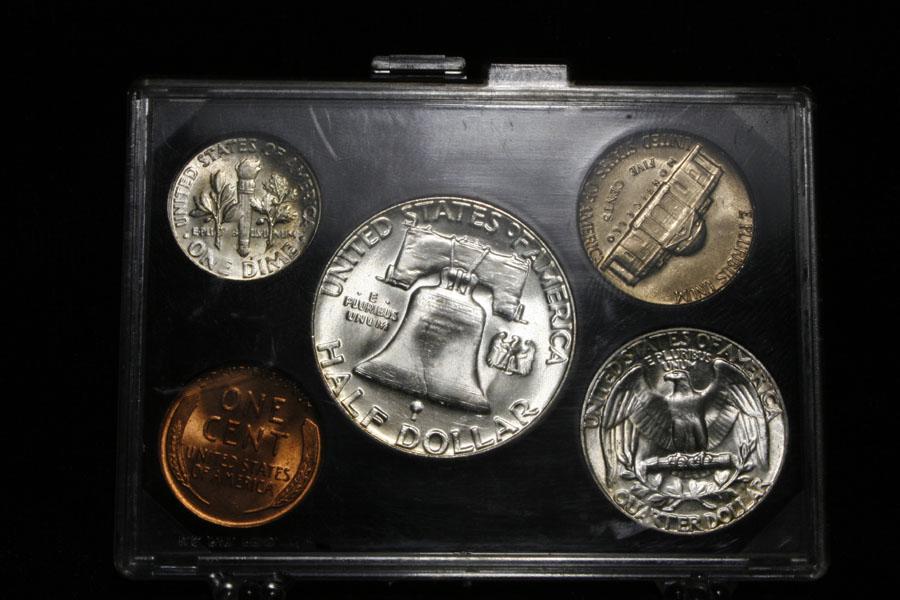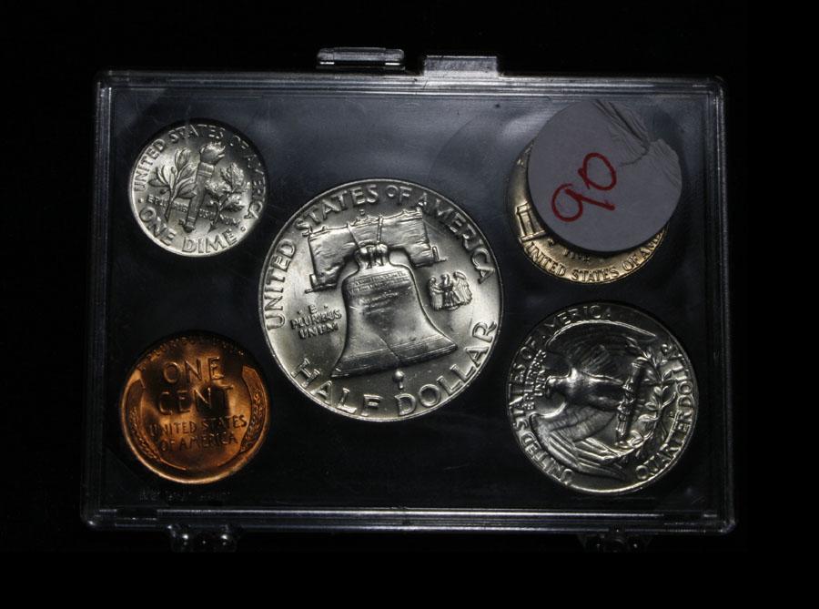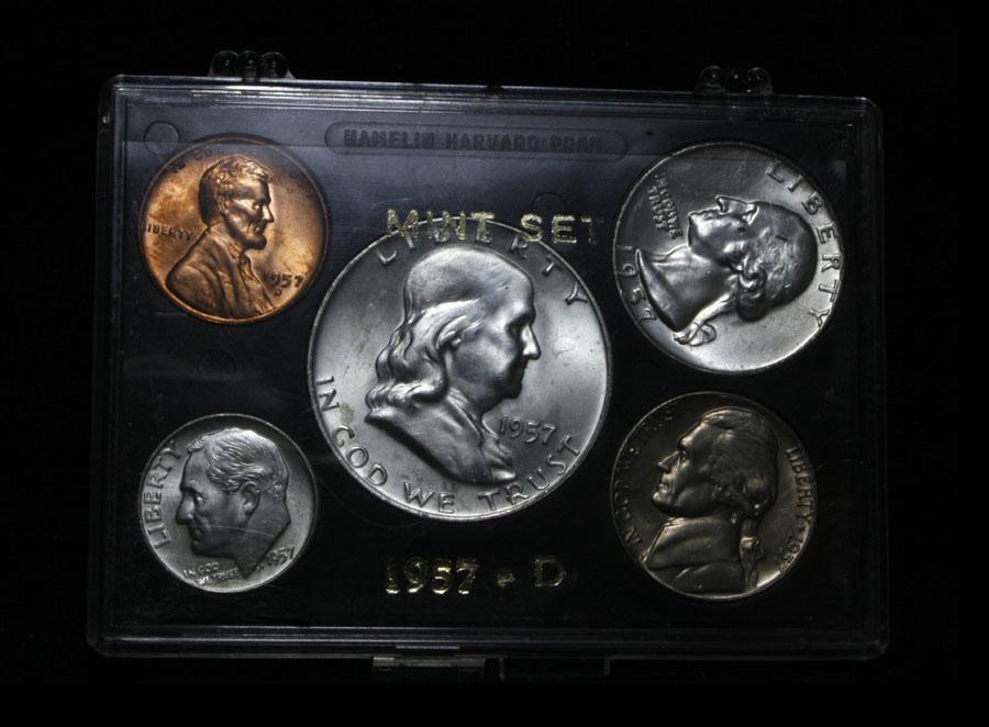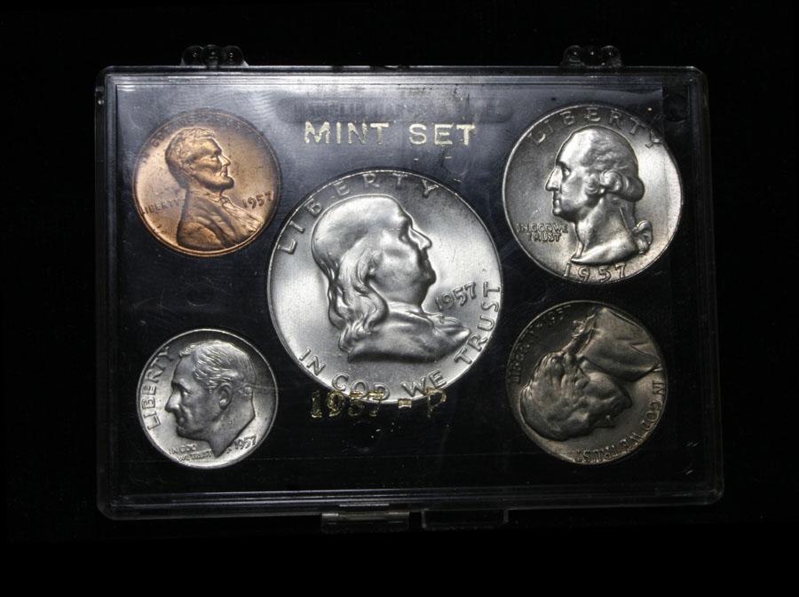 I would estimate the grades to range from ms63 to ms66. This lot includes The entire 1957 Mint Set, which consists of 10 coins, both the 1957-p run and the 1957-d run. It has $1.70 in Face Value of 90% silver, which translates to 1.2294 troy ounces of Silver, or $43.32 in Silver value. This lot is part of a cool private consignment which I have broken up into 17 lots in this auction. Half of the lots are very attractive all original and mostly attractively toned Roosevelt dimes which are in not often seen triple 2x2 holders. most have obviously been carefully hand picked. The other 8 lots are fantastic cherry picked Mint sets running from 1957-1964, all are wonderful, and again in cool old fashioned folders. The Wholesale Greysheet lists a 1957 Mint set at $210, but that's in the original government holder. While I do feel these are the exact coins from a 1957 Mint set (due to the source of the consignment and the holders they arrived in and the condition of the coins) a 25% deduction is in order due to the change in packaging. Estimated Value $150