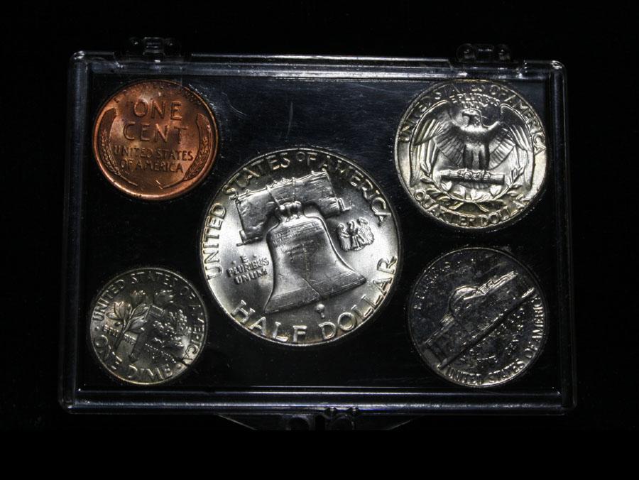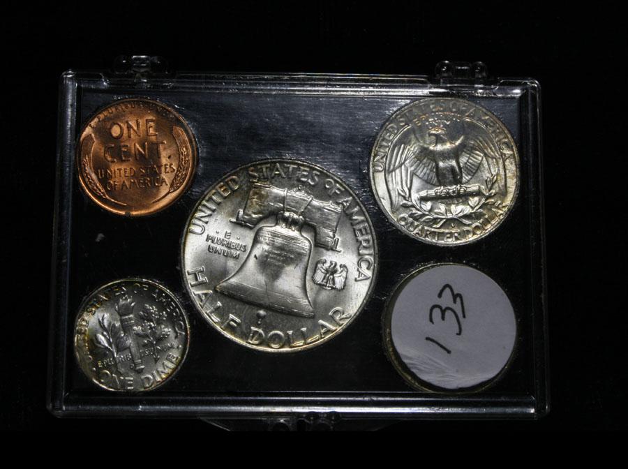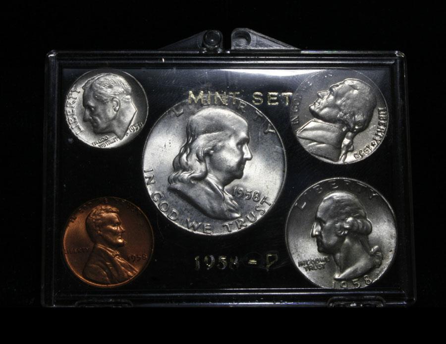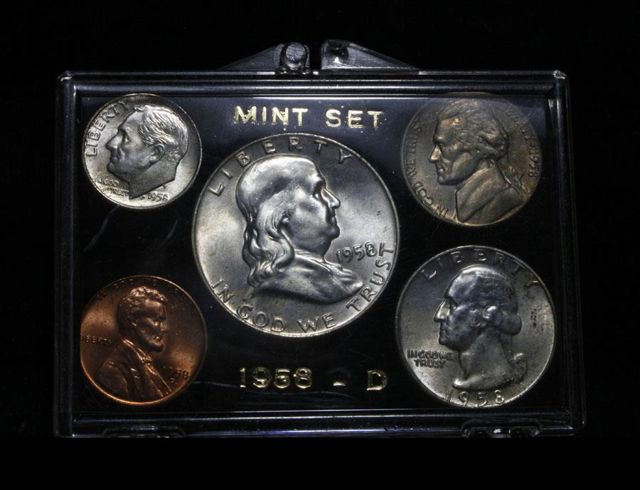 I would estimate the grades to range from ms63 to ms66. The 58-d Dime has FSB and the 58-d Franklin has FBL This lot includes The entire 1958 Mint Set, which consists of 10 coins, both the 1958-p run and the 1958-d run. It has $1.70 in Face Value of 90% silver, which translates to 1.2294 troy ounces of Silver, or $43.32 in Silver value. This lot is part of a cool private consignment which I have broken up into 17 lots in this auction. Half of the lots are very attractive all original and mostly attractively toned Roosevelt dimes which are in not often seen triple 2x2 holders. most have obviously been carefully hand picked. The other 8 lots are fantastic cherry picked Mint sets running from 1957-1964, all are wonderful, and again in cool old fashioned folders. The Wholesale Greysheet lists a 1958 Mint set at $115, but that's in the original government holder. While I do feel these are the exact coins from a 1958 Mint set (due to the source of the consignment and the holders they arrived in and the condition of the coins) a 25% deduction is in order due to the change in packaging. Estimated Value $75