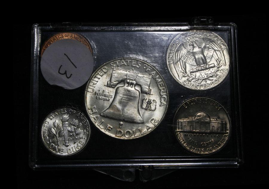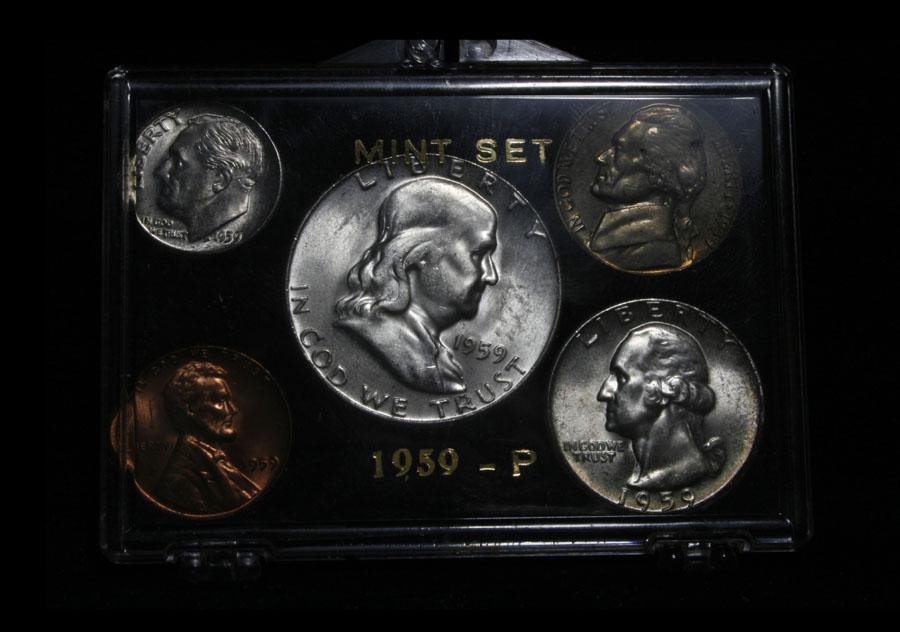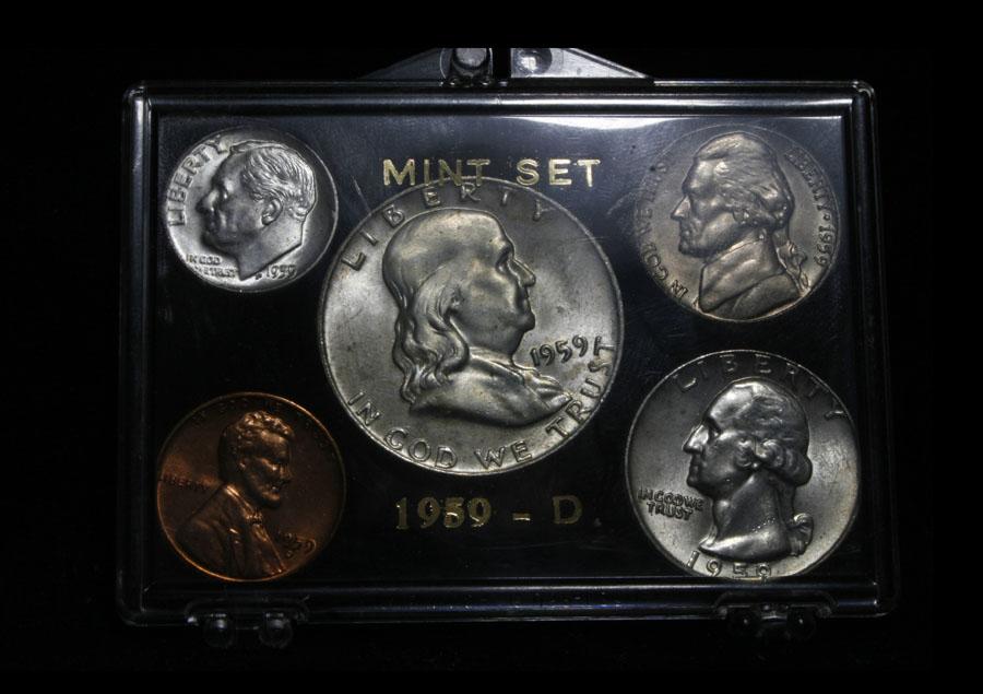 I would estimate the grades to range from ms63 to ms66. This lot includes The entire 1959 Mint Set, which consists of 10 coins, both the 1959-p run and the 1959-d run. It has $1.70 in Face Value of 90% silver, which translates to 1.2294 troy ounces of Silver, or $43.32 in Silver value. This lot is part of a cool private consignment which I have broken up into 17 lots in this auction. Half of the lots are very attractive all original and mostly attractively toned Roosevelt dimes which are in not often seen triple 2x2 holders. most have obviously been carefully hand picked. The other 8 lots are fantastic cherry picked Mint sets running from 1957-1964, all are wonderful, and again in cool old fashioned folders. Estimated Value $60