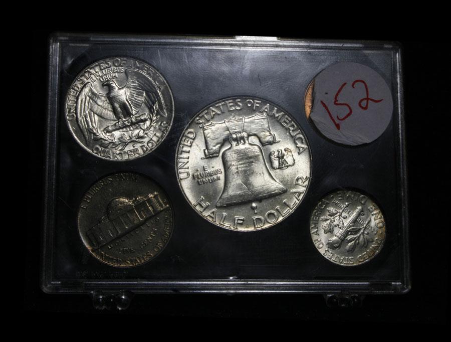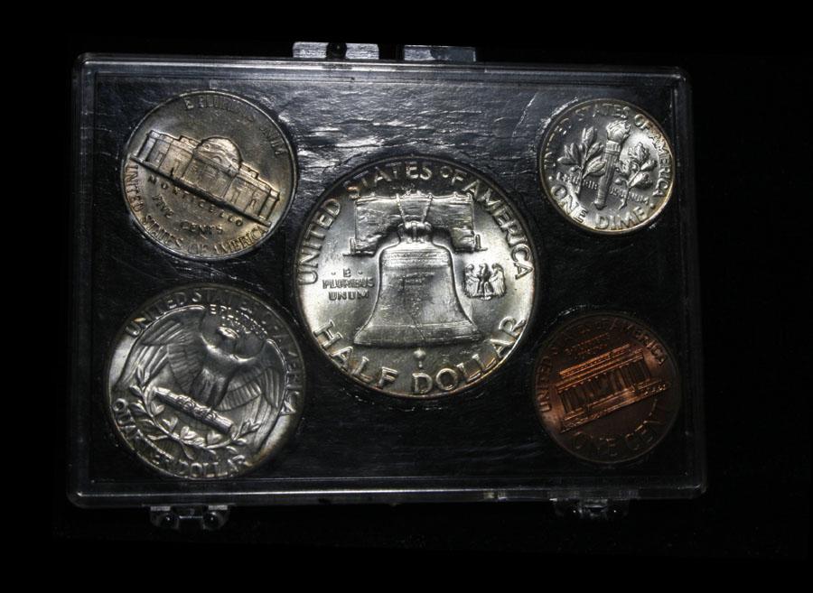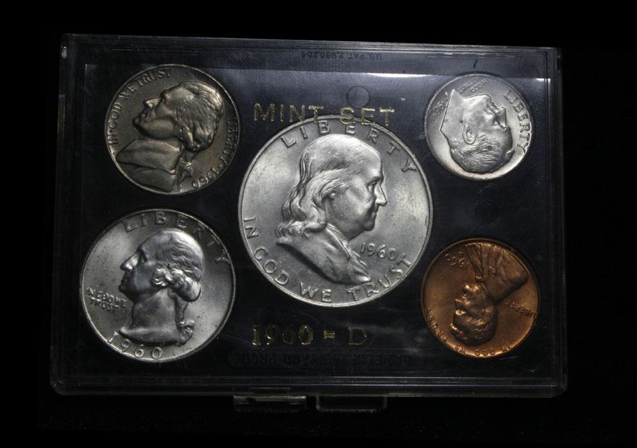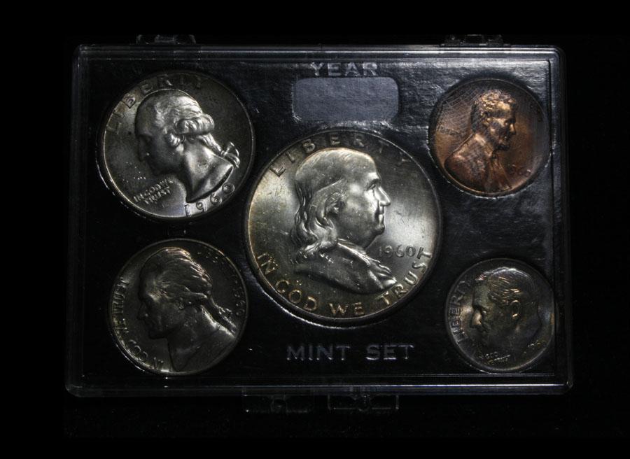 I would estimate the grades to range from ms63 to ms66.The dime is the highlight, it is fantastically Rainbow toned. This lot includes The entire 1960 Mint Set, which consists of 10 coins, both the 1960-p run and the 1960-d run. It has $1.70 in Face Value of 90% silver, which translates to 1.2294 troy ounces of Silver, or $43.32 in Silver value. This lot is part of a cool private consignment which I have broken up into 17 lots in this auction. Half of the lots are very attractive all original and mostly attractively toned Roosevelt dimes which are in not often seen triple 2x2 holders. most have obviously been carefully hand picked. The other 8 lots are fantastic cherry picked Mint sets running from 1957-1964, all are wonderful, and again in cool old fashioned folders. Estimated Value $100