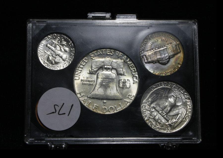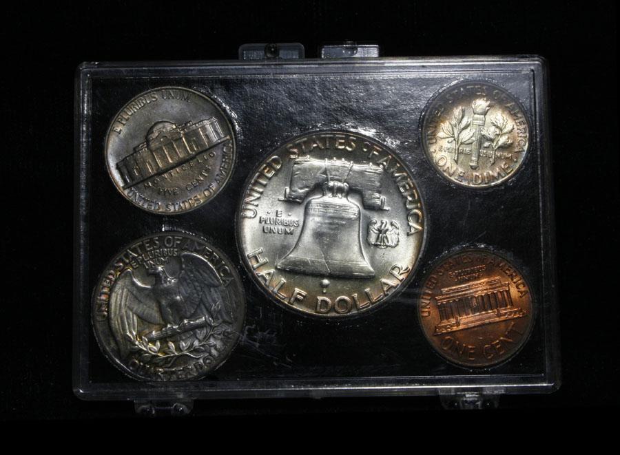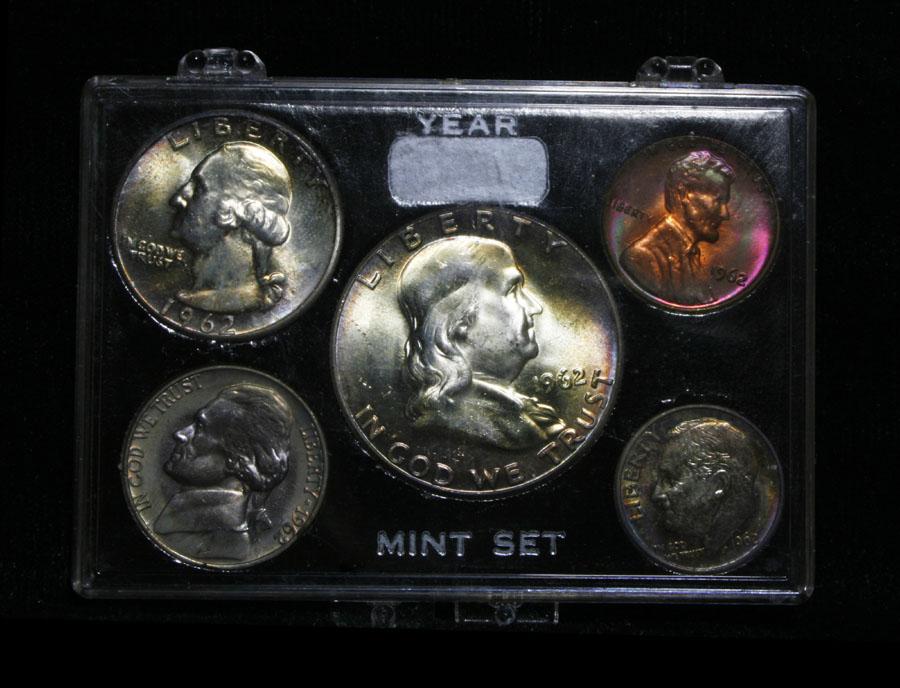 I would estimate the grades to range from ms63 to ms66. Wonderful rainbow colors on the P set. This lot includes The entire 1962 Mint Set, which consists of 10 coins, both the 1962-p run and the 1962-d run. It has $1.70 in Face Value of 90% silver, which translates to 1.2294 troy ounces of Silver, or $43.32 in Silver value. This lot is part of a cool private consignment which I have broken up into 17 lots in this auction. Half of the lots are very attractive all original and mostly attractively toned Roosevelt dimes which are in not often seen triple 2x2 holders. most have obviously been carefully hand picked. The other 8 lots are fantastic cherry picked Mint sets running from 1957-1964, all are wonderful, and again in cool old fashioned folders. Estimated Value $100