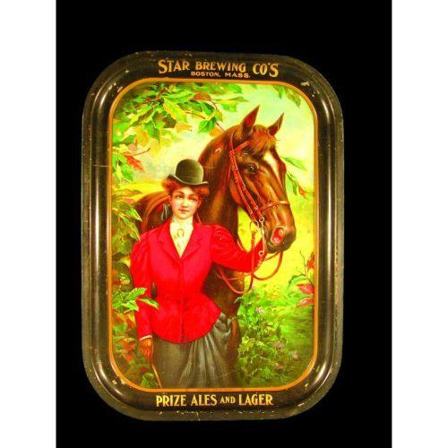 Prize Ales and Lager Tin Serving Tray, Star Brewing Co., Boston, MA, few scratches mostly on the rim otherwise very good condition, 12 1/4 x 17 1/4 inches.