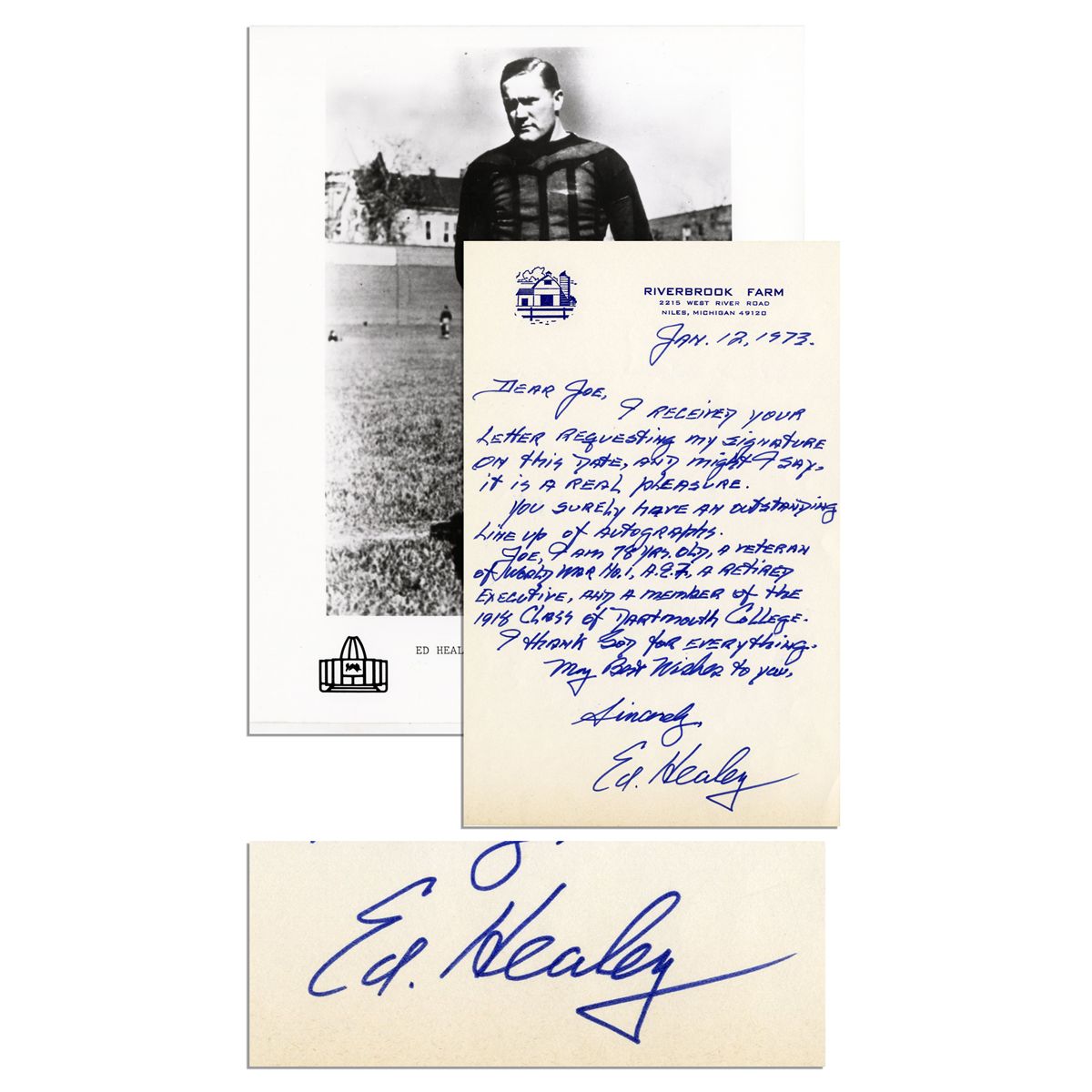 Pro Football Hall of Fame inductee Ed Healey autograph letter signed from 12 January 1973. Healey writes on his Riverbrook Farm stationery, ''...Joe, I am 78 yrs old, a veteran of World War No. 1, A.E.F, A retired executive, and a member of the 1918 class of Dartmouth College. I thank God for everything. My best wishes to you, Sincerely, Ed. Healey''. Healey played for the Rock Island Independents and the Chicago Bears during the 1920's. Letter measures 5.5'' x 8.5'' in fine condition. Glossy print of Ed Healey included.