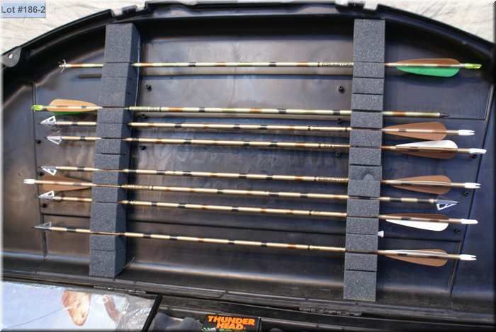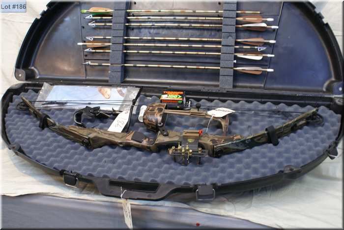 Pro Sport Bow mod Shadow Compound Bow [ brown camo finish, complete w/sights, quiver, eight various arrows, box Thunder Head blades, HH A release, in black plastic foam lined w/targets, 45-65 Lb pull, 27 - 28 length, Right Hand ] Ser # SH 11457