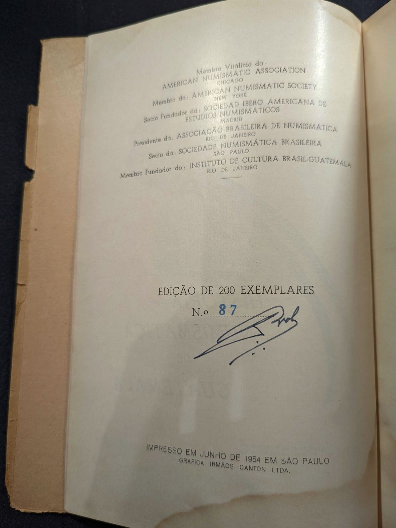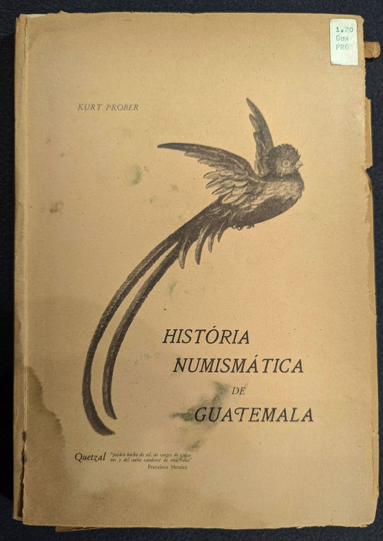 Prober, Kurt. HISTORIA NUMISMATICA DE GUATEMALA. Grafica Irmaos Canton. 1954. 8vo. (2), 184, (2) pages. Sao Paulo. Original tan printed card covers, covers chipped. evidence of water staining else contents near fine. 18 b&w coin plates. 2 b&w orders & decorations plates. 1 line illustrated plate. Tables. Bibliography. Limited edition, copy #87 of 200. Signed by author. This book is a thorough classic work on Guatemalan coins of all periods, with document transcripts and many charts and tables. An excellent candidate for a hardcover binding. Clain-Stefanelli #9958. Lot weight: 0 lbs 13oz. Subject(s): Guatemalan Coinage.