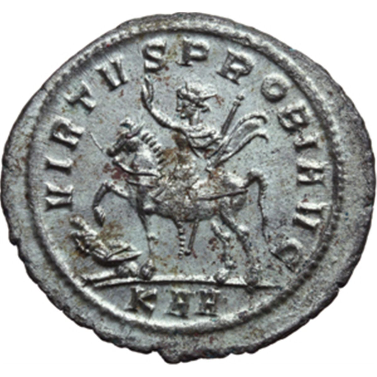 Impero Romano. Probo (276-282). Antoniniano, Cyzico. D/ IMP C M AVR PROBVS P AVG. Busto elmato, radiato e corazzato a sinistra, che tiene lancia e scudo. R/ VIRTVS PROBI AVG. L'imperatore su cavallo al passo a sinistra solleva la mano destra e tiene scettro. Sotto la zampa sollevata del cavallo, un prigioniero. In esergo: KAA. Cfr. RIC 887/888 var. AE. g. 3.72 mm. 25.50 SPL. Di grande qualitv†. Modulo straordinario e piena argentatura.