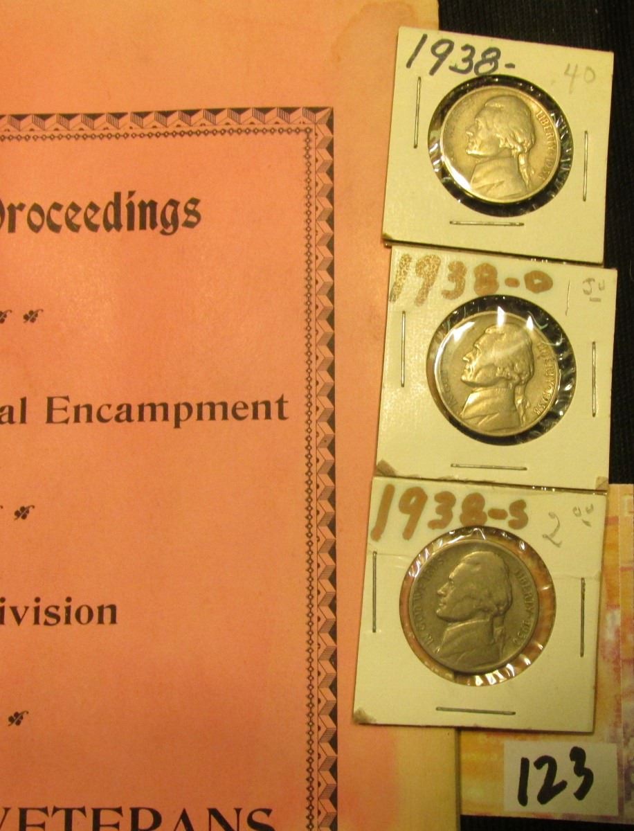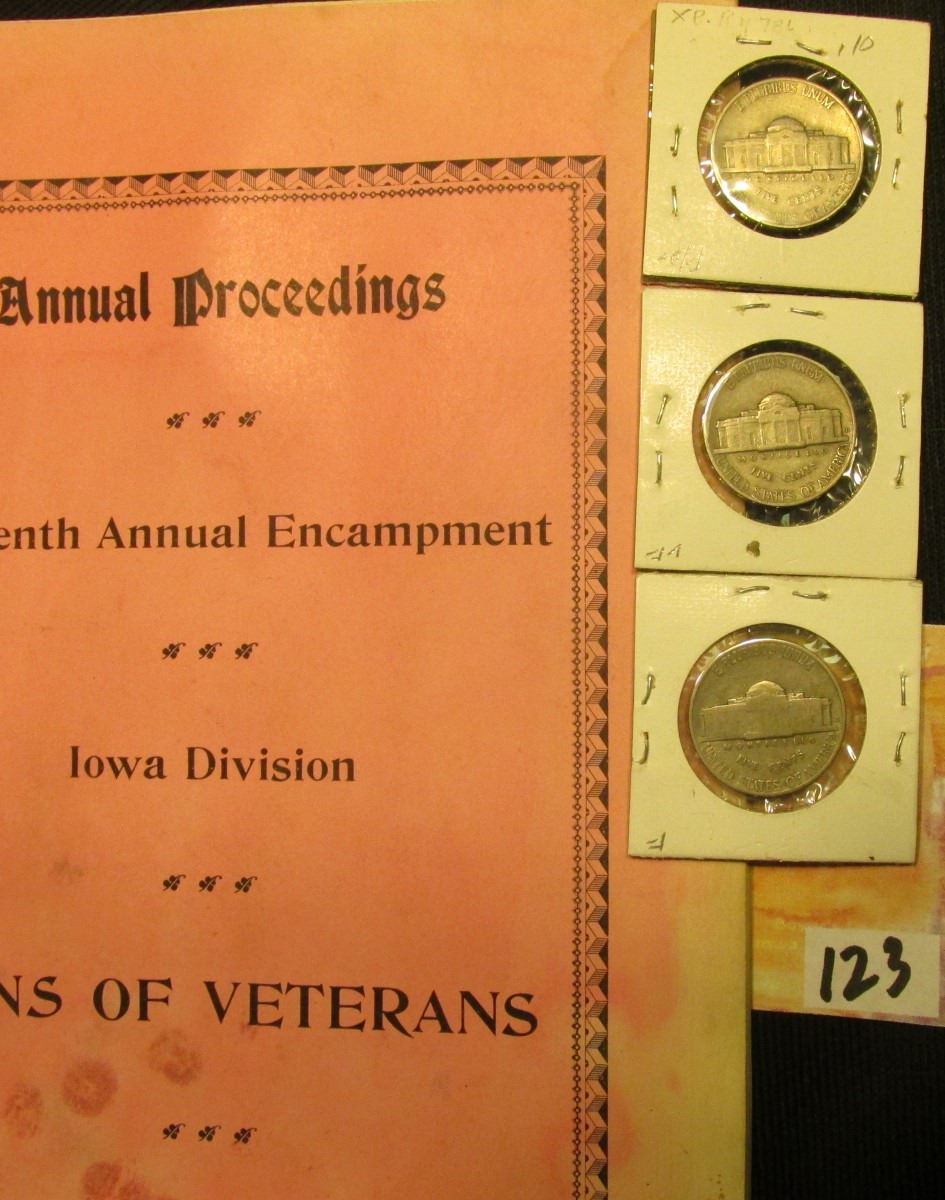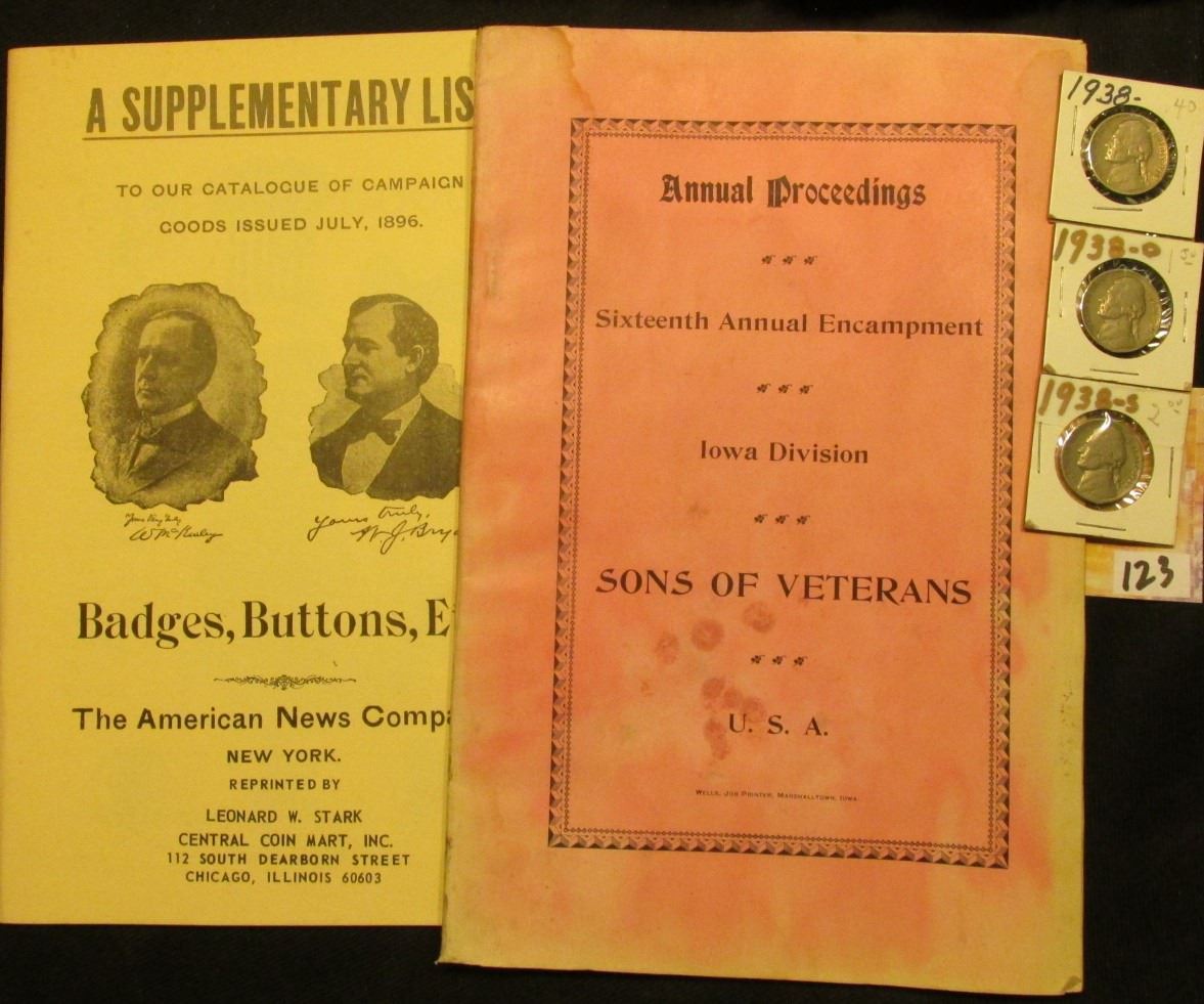 "Proceedings of Sixteenth Annual Encampment Iowa Division Sons of Veterans U.S.A. Held at Waterloo, Iowa June 13, 14, and 15th, 1899" Compiled by Will A. Brown Division Commander Iowa Division of S. of V.' ; Supplementary List to our Catalogue of Campaign Goods Issued July, 1896…The American News Company..." reprinted by Leonard Stark; & a set of 1938 P, D, & S Jefferson Nickels.