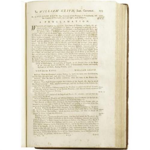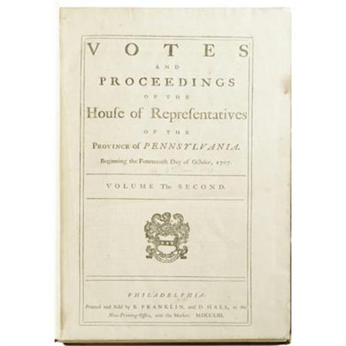 <B>Benjamin Franklin Printing: <I>Votes and Proceedings of the House of Representatives of the Province of Pennsylvania Beginning The 14th Day of October 1707</B></I></B></I> (Philadelphia: Benjamin Franklin, 1753), Second Volume. 494 pages. Folio (9.75" x 14.75") Signed "<I>James Wright 1754</B></I>" on front end leaf. Contemporary calf with raised bands. Covers proceedings through June 6, 1726. Moderate foxing throughout. Front hinge cracked. Various abrasions and water stains on cover. <I>Ex. Henry E. Luhrs Collection. </B></I><BR><BR><b>Shipping:</b> Books & Catalogs (<a target="_blank" href="http://www.heritageauctions.com/common/shipping.php">view shipping information</a>)
