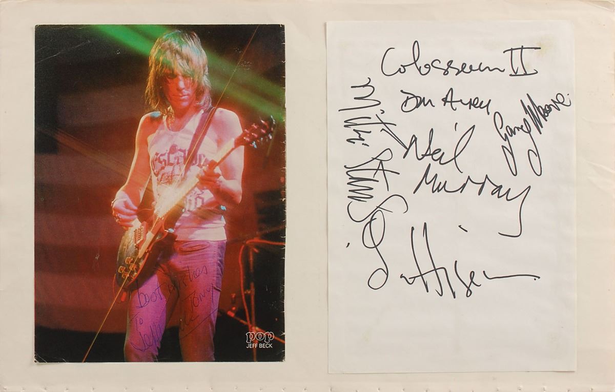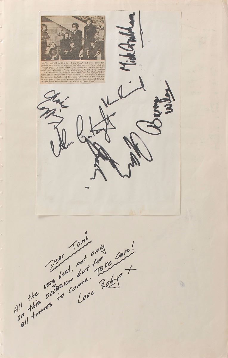 Off-white 13 x 20.5 scrapbook page bearing an affixed off-white 8.25 x 11.75 sheet with an affixed newspaper photo, signed on the sheet in black felt tip by Keith Reid, Mick Grabham, Alan Cartwright, Chris Copping, and two others, and inscribed below on the scrapbook page in black felt tip by Robin Trower, “Dear Toni, All the very best, not only on this occasion but for all times to come, Take care! Love Robyn X.” Reverse of the page bears an affixed color magazine photo of Jeff Beck playing the guitar, signed and inscribed in blue ballpoint, “Best wishes, to Tony, Jeff Beck,” and an affixed off-white 8.25 x 11.75 sheet signed in black felt tip by several members of Colosseum II, including: Don Airey, Neil Murray, Mike Starrs, Gary Moore, and Jon Hiseman. In overall very good to fine condition. Consignor notes that these vintage signatures were obtained in person in Vienna during the early to mid-1970s.